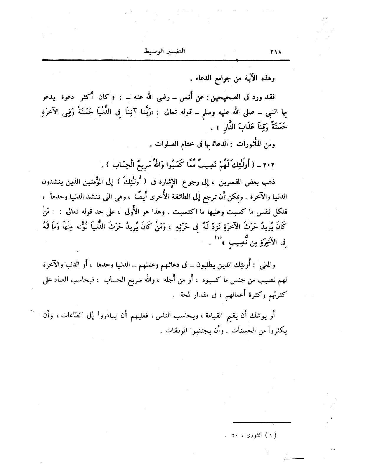 ذهب بعض المفسرين، إلى رجوع الإشارة في {أُولئِكَ} إلى المؤمنين الذين ينشدون الدنيا والآخرة. ويمكن أن ترجع إلى الطائفة الأُخرى أيضًا، وهي التي تنشد الدنيا وحدها، فلكل نفس ما كسبت وعليها ما اكتسبت. وهذا هو الأولى، على حد قوله تعالى: {مَنْ كَانَ يُرِيدُ حَرْثَ الْآخِرَةِ نَزِدْ لَهُ فِي حَرْثِهِ وَمَنْ كَانَ يُرِيدُ حَرْثَ الدُّنْيَا نُؤْتِهِ مِنْهَا وَمَا لَهُ فِي الْآخِرَةِ مِنْ نَصِيبٍ} (1).