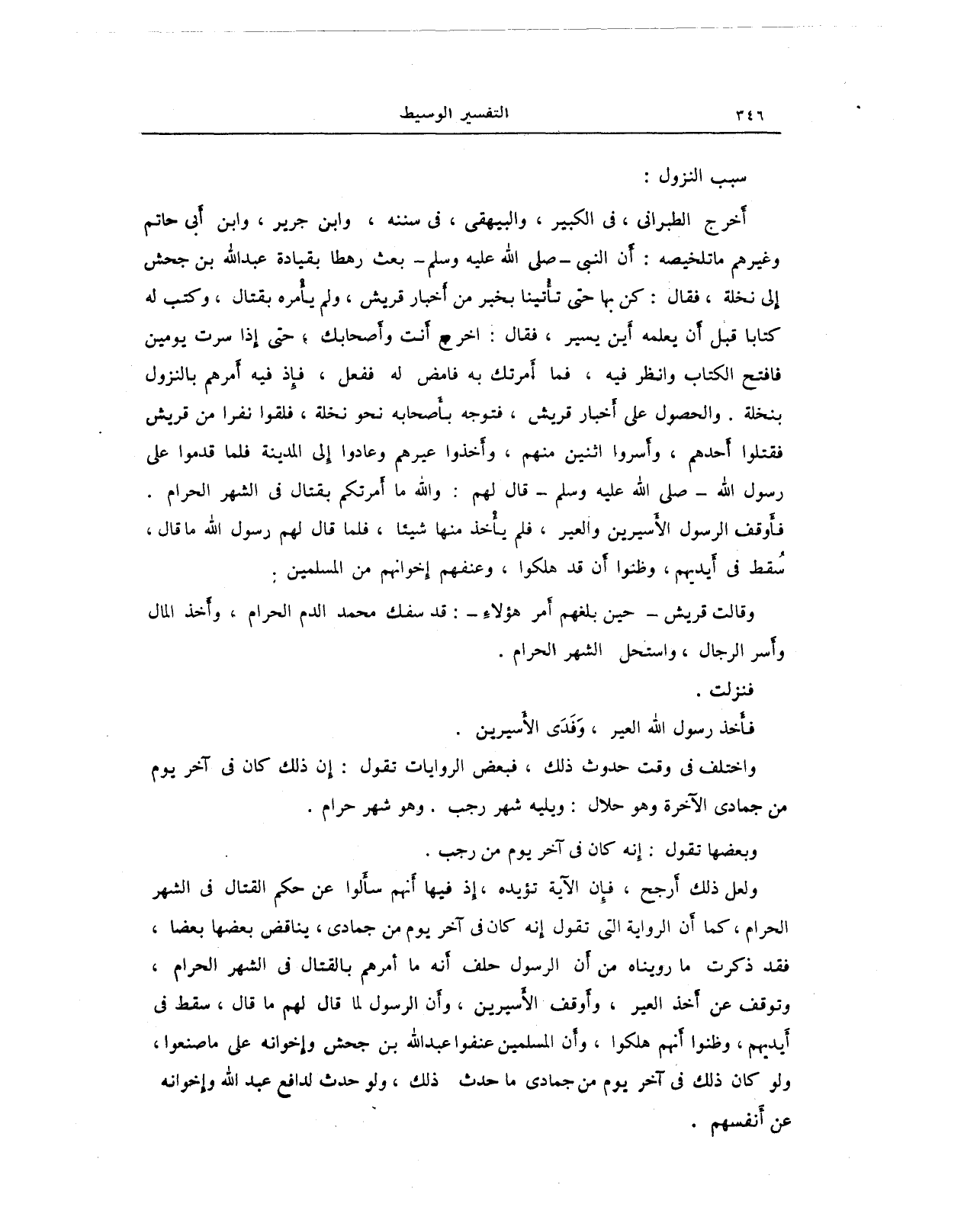 أخرج الطبراني في الكبير، والبيهقي في سننه، وابن جرير، وابن أبي حاتم وغيرهم ما تلخيصه: أن النبي - صلى الله عليه وسلم - بعث رهطًا بقيادة عبد الله بن جحش إلى نخلة، فقال: كن بها حتى تأتينا بخبر من أخبار قريش، ولم يامره بقتال، وكتب له كتابًا قبل أن يعلمه أين يسير، فقال: اخرج أنت وأصحابك، حتى إذا سرت يومين فافتح الكتاب وانظر فيه، فما أَمرتك به فامض له ففعل، فإذ فيه أمرهم بالنزول بنخلة، والحصول على أخبار قريش. فتوجه بأصحابه نحو نخلة، فلقوا نفرًا من قريش فقتلوا أحدهم، وأسروا اثنين منهم، وأخذوا عيرهم وعادوا إلى المدينة فلما قدموا على رسول الله - صلى الله عليه وسلم - قال لهم: والله ما أمرتكم بقتال في الشهر الحرام.