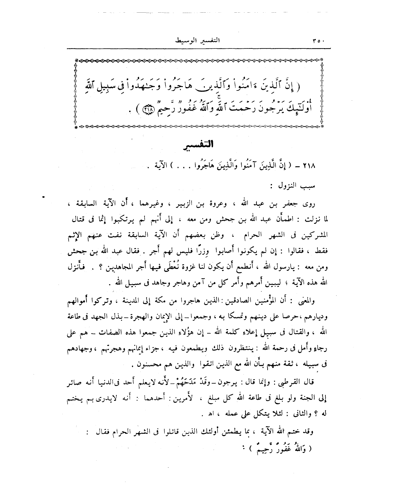 والمعنى: أن المؤمنين الصادقين: الذين هاجروا من مكة إلى المدينة، وتركوا أموالهم وديارهم، حرصًا على دينهم وتمسكًا به، وجمعوا - إلى الإيمان والهجرة - بذل الجهد في طاعة الله، والقتال في سبيل إعلاء كلمة الله - إن هؤُلاء جمعوا هذه الصفات - هم على رجاءٍ وأمل في رحمة الله: ينتظرون ذلك ويطمعون فيه، جزاء إيمانهم وهجرتهم، وجهادهم في سبيله، ثقة منهم بأن الله مع الذين اتقوا والذين هم محسنون.