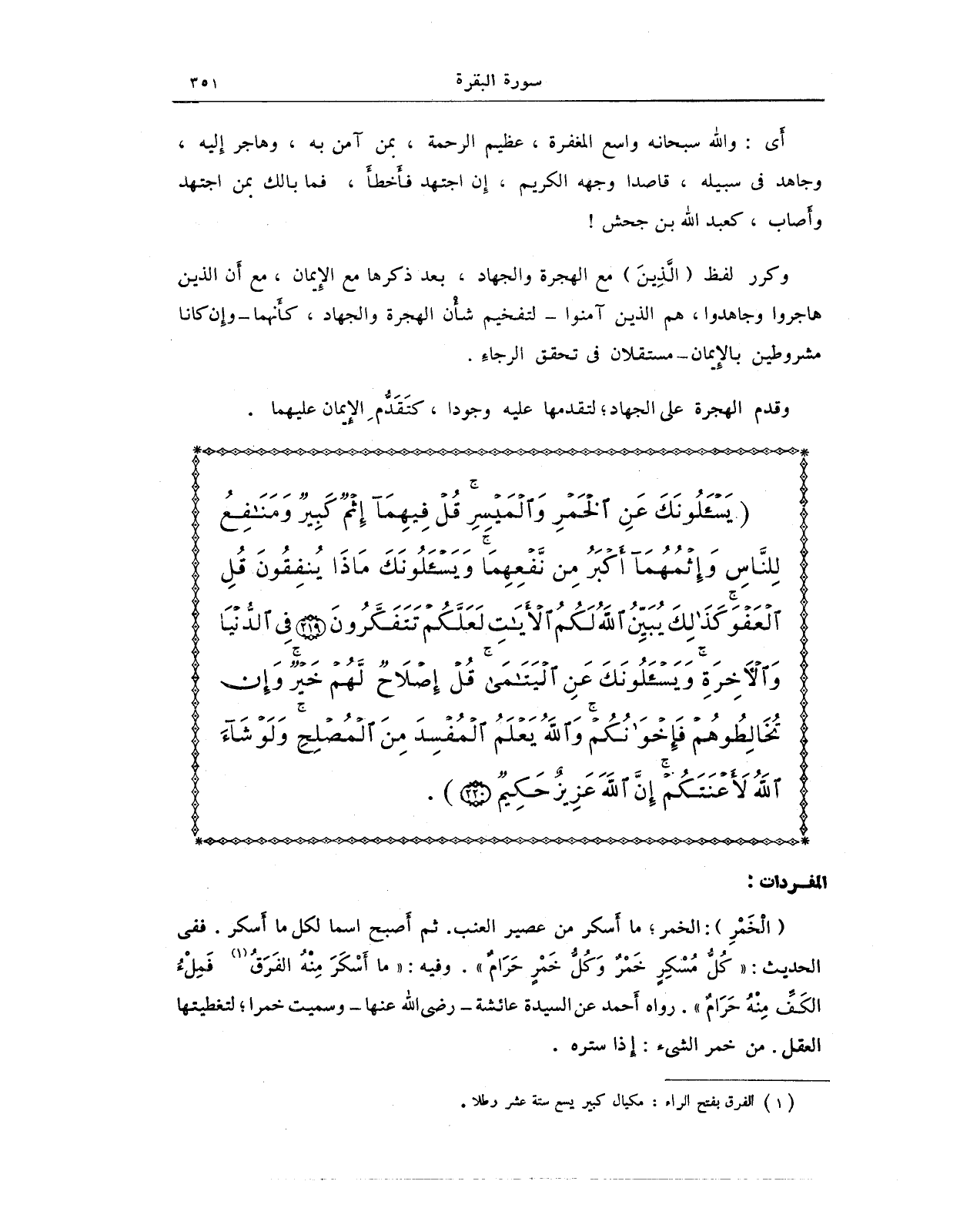 {يَسْأَلُونَكَ عَنِ الْخَمْرِ وَالْمَيْسِرِ قُلْ فِيهِمَا إِثْمٌ كَبِيرٌ وَمَنَافِعُ لِلنَّاسِ وَإِثْمُهُمَا أَكْبَرُ مِنْ نَفْعِهِمَا وَيَسْأَلُونَكَ مَاذَا يُنْفِقُونَ قُلِ الْعَفْوَ كَذَلِكَ يُبَيِّنُ اللَّهُ لَكُمُ الْآيَاتِ لَعَلَّكُمْ تَتَفَكَّرُونَ (219) فِي الدُّنْيَا وَالْآخِرَةِ وَيَسْأَلُونَكَ عَنِ الْيَتَامَى قُلْ إِصْلَاحٌ لَهُمْ خَيْرٌ وَإِنْ تُخَالِطُوهُمْ فَإِخْوَانُكُمْ وَاللَّهُ يَعْلَمُ الْمُفْسِدَ مِنَ الْمُصْلِحِ وَلَوْ شَاءَ اللَّهُ لَأَعْنَتَكُمْ إِنَّ اللَّهَ عَزِيزٌ حَكِيمٌ (220)}