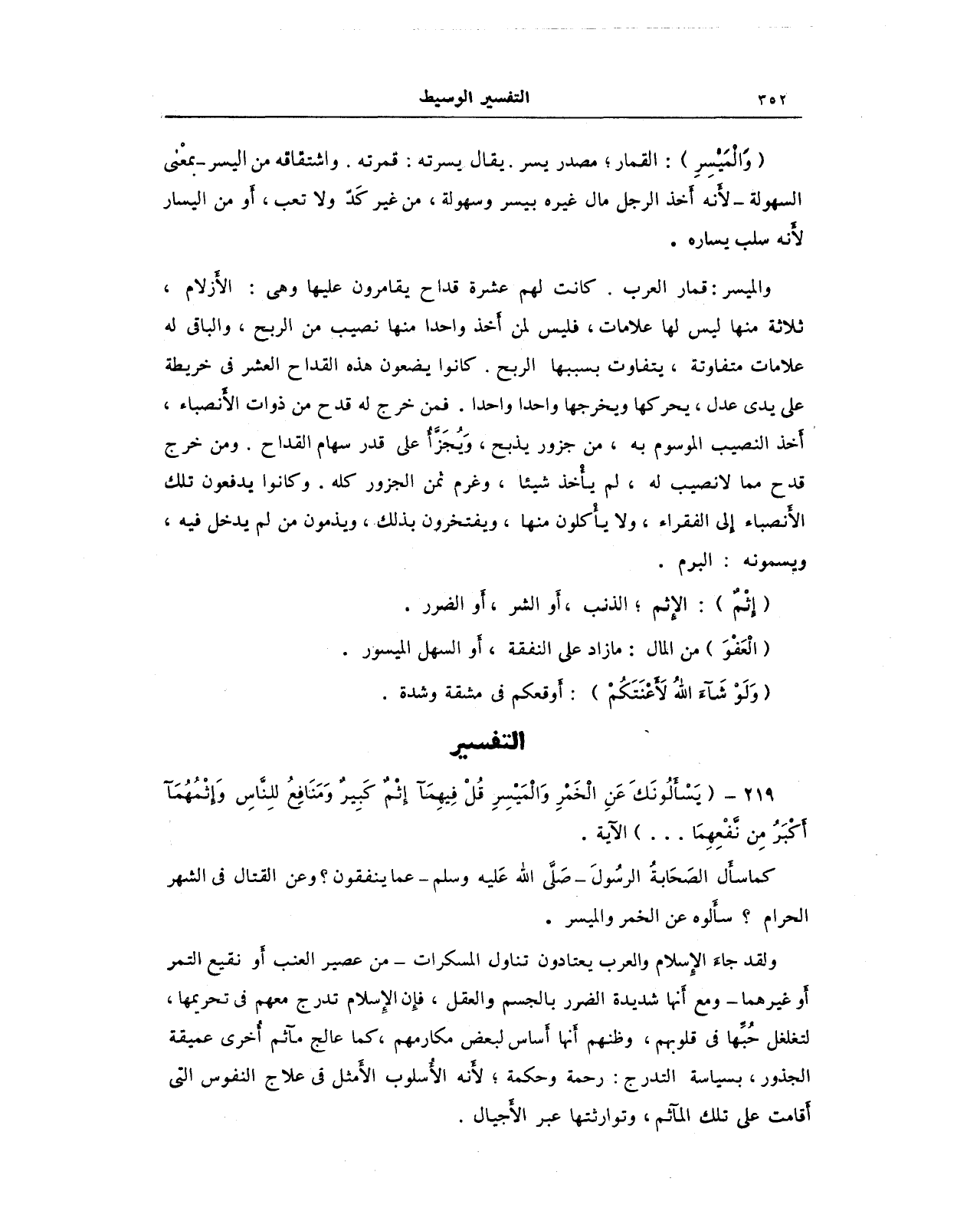 {وَالْمَيْسِرِ}: القمار، مصدر يسر. يقال يسرته: قمرته. واشتقاقه من اليسر - بمعنى السهولة - لأَنه أخذ الرجل مال غيره بيسر وسهولة، من غير كَدّ ولا تعب، أو من اليسار لأنه سلب يساره.