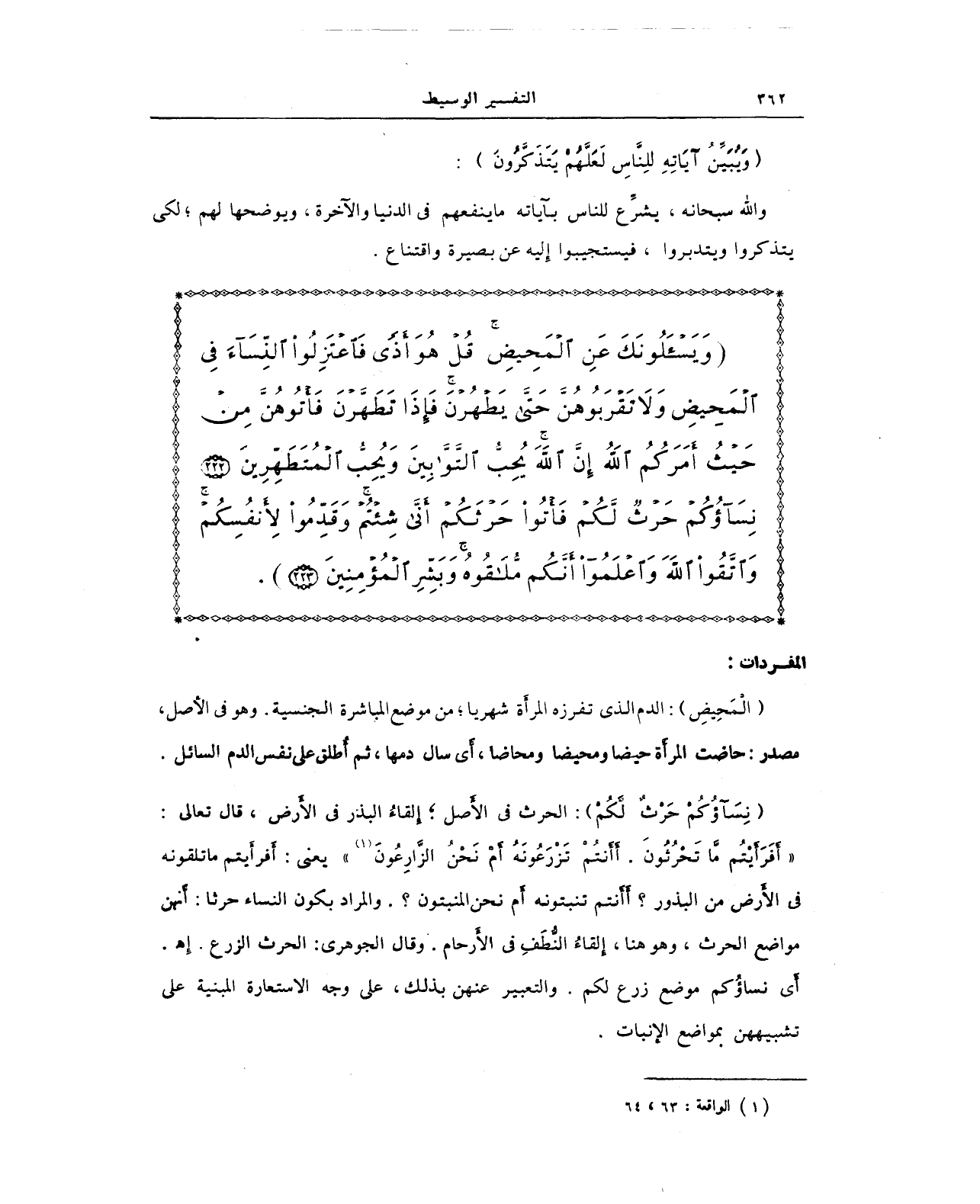 {وَيَسْأَلُونَكَ عَنِ الْمَحِيضِ قُلْ هُوَ أَذًى فَاعْتَزِلُوا النِّسَاءَ فِي الْمَحِيضِ وَلَا تَقْرَبُوهُنَّ حَتَّى يَطْهُرْنَ فَإِذَا تَطَهَّرْنَ فَأْتُوهُنَّ مِنْ حَيْثُ أَمَرَكُمُ اللَّهُ إِنَّ اللَّهَ يُحِبُّ التَّوَّابِينَ وَيُحِبُّ الْمُتَطَهِّرِينَ (222) نِسَاؤُكُمْ حَرْثٌ لَكُمْ فَأْتُوا حَرْثَكُمْ أَنَّى شِئْتُمْ وَقَدِّمُوا لِأَنْفُسِكُمْ وَاتَّقُوا اللَّهَ وَاعْلَمُوا أَنَّكُمْ مُلَاقُوهُ وَبَشِّرِ الْمُؤْمِنِينَ (223)}