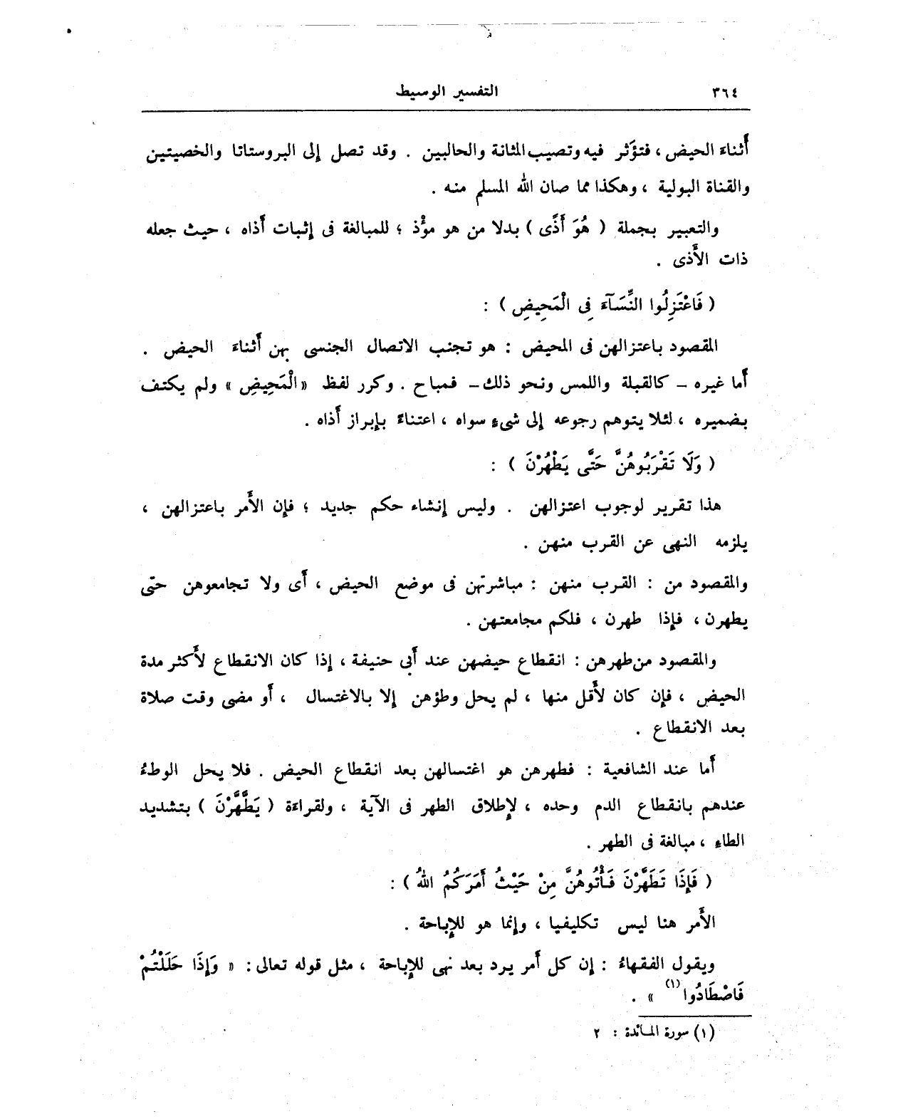 المقصود باعتزالهن في المحيض: هو تجنب الاتصال الجنسي بهن أثناءَ الحيض. أما غيره - كالقبلة واللمس ونحو ذلك - فمباح. وكرر لفظ {الْمَحِيضِ} ولم يكتف بضميره، لئلا يتوهم رجوعه إلى شيء سواه، اعتناءً بإبراز أَذاه.