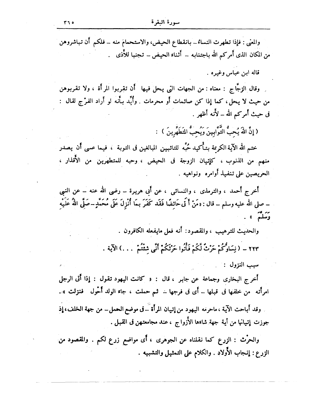وقد أباحت الآية، ما حرمه اليهود من إتيان المرأة - في موضع الحمل - من جهة الخلف، إذ جوزت إتيانها من أية جهة شاءَها الأزواج، عند مجامعتهن في القبل.