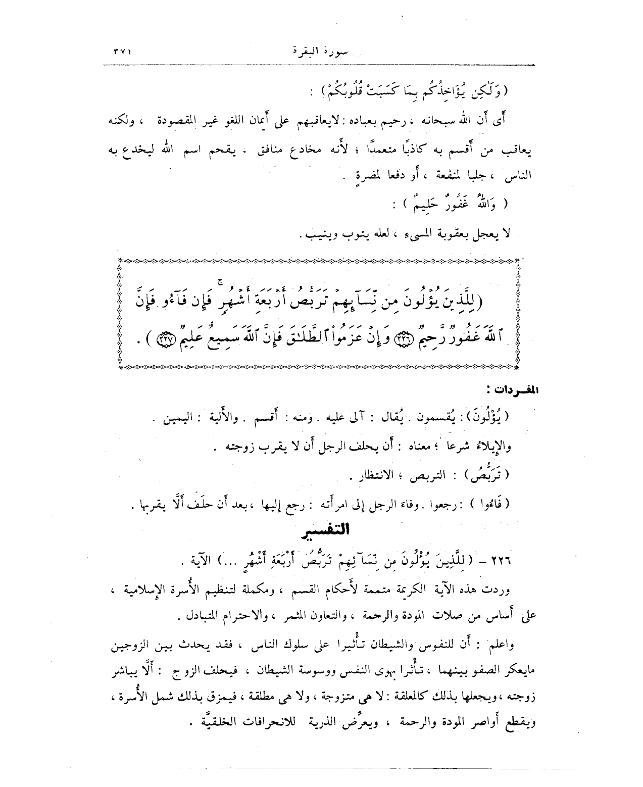 226 - {لِّلَّذِينَ يُؤْلُونَ مِن نِّسَائِهِمْ تَرَبُّصُ أَرْبَعَةِ أَشْهُرٍ ... } الآية.