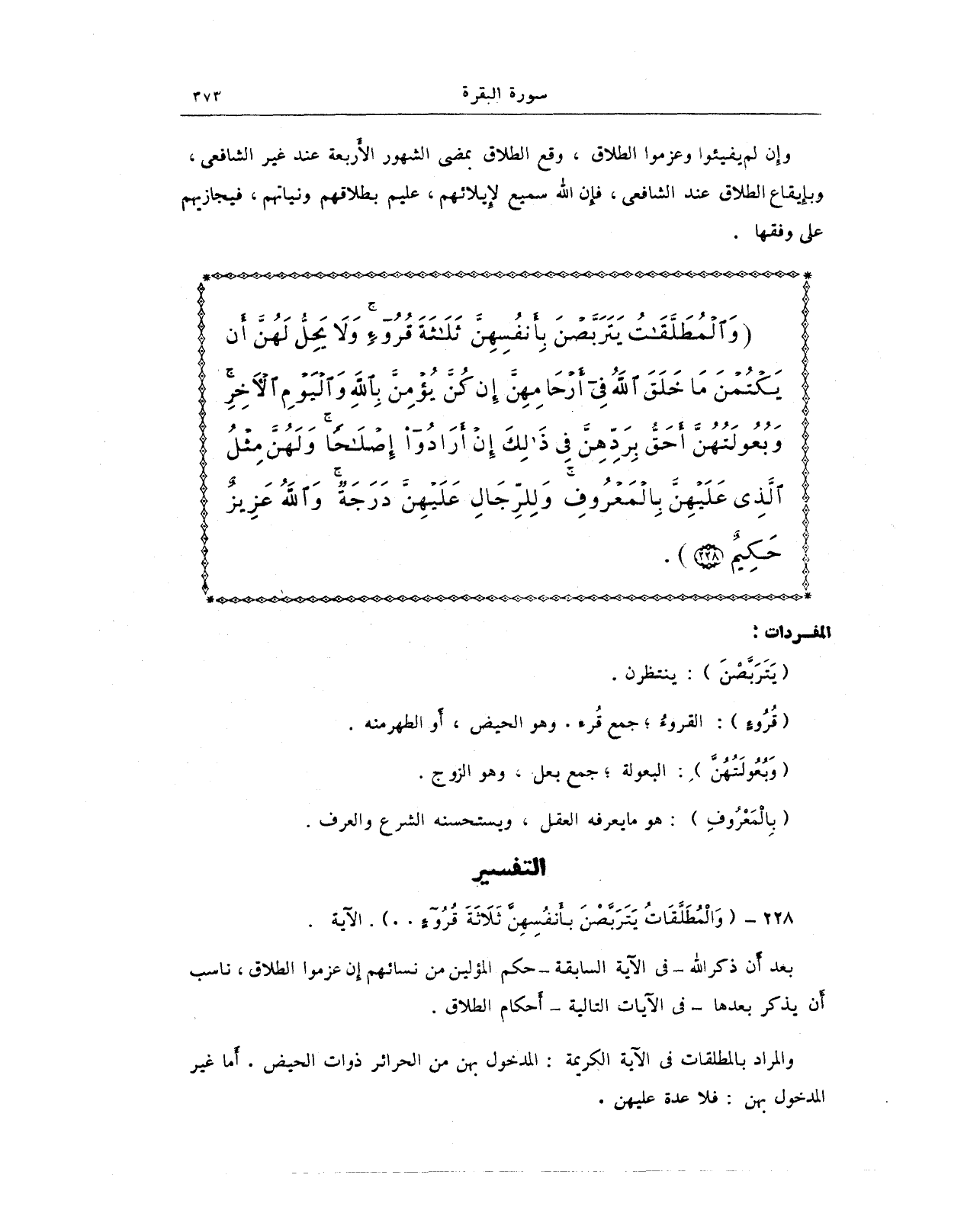 228 - {وَالْمُطَلَّقَاتُ يَتَرَبَّصْنَ بِأَنفُسِهِنَّ ثَلَاثَةَ قُرُوءٍ ... } الآية.
