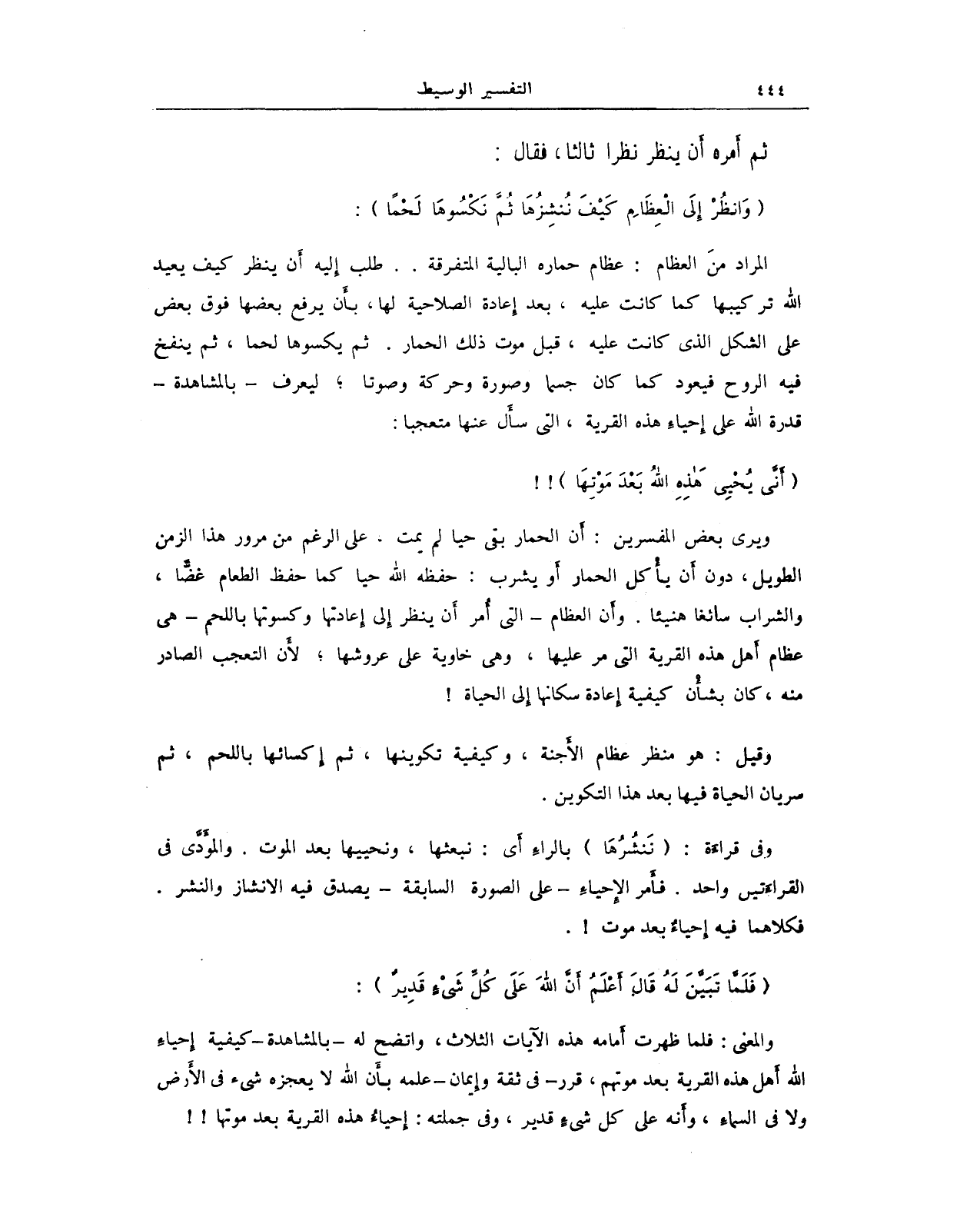 والمعنى: فلما ظهرت أمامه هذه الآيات الثلاث، واتضح له - بالمشاهدة - كيفية إحياء الله أهل هذه القرية بعد موتهم، قرر - في ثقة وإيمان - علمه بأَن الله لا يعجزه شيء في الأرض ولا في السماء، وأنه على كل شيء قدير، وفي جملته: إحياءُ هذه القرية بعد موتها!!
