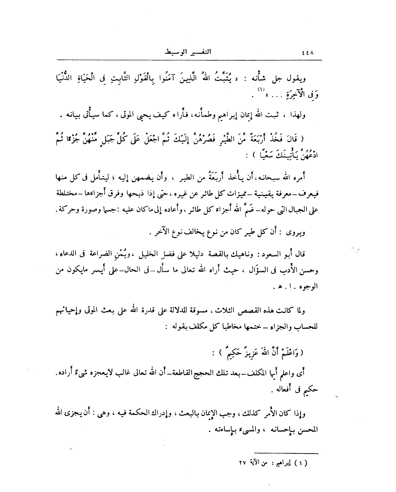 وقال أبو السعود: وناهيك بالقصة دليلا على فضل الخليل، ويُمْنِ الضراعة في الدعاء، وحسن الأدب في السؤال، حيث أراه الله تعالى ما سأل - في الحال - على أيسر ما يكون من الوجوه. ا. هـ.