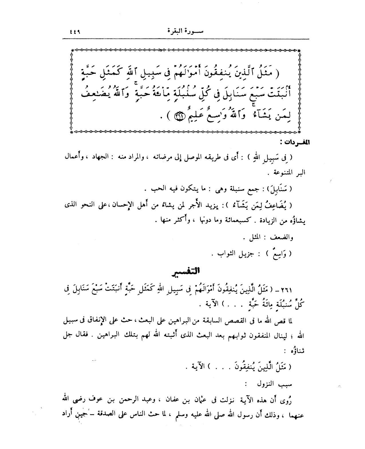{مَثَلُ الَّذِينَ يُنْفِقُونَ أَمْوَالَهُمْ فِي سَبِيلِ اللَّهِ كَمَثَلِ حَبَّةٍ أَنْبَتَتْ سَبْعَ سَنَابِلَ فِي كُلِّ سُنْبُلَةٍ مِائَةُ حَبَّةٍ وَاللَّهُ يُضَاعِفُ لِمَنْ يَشَاءُ وَاللَّهُ وَاسِعٌ عَلِيمٌ (261)}