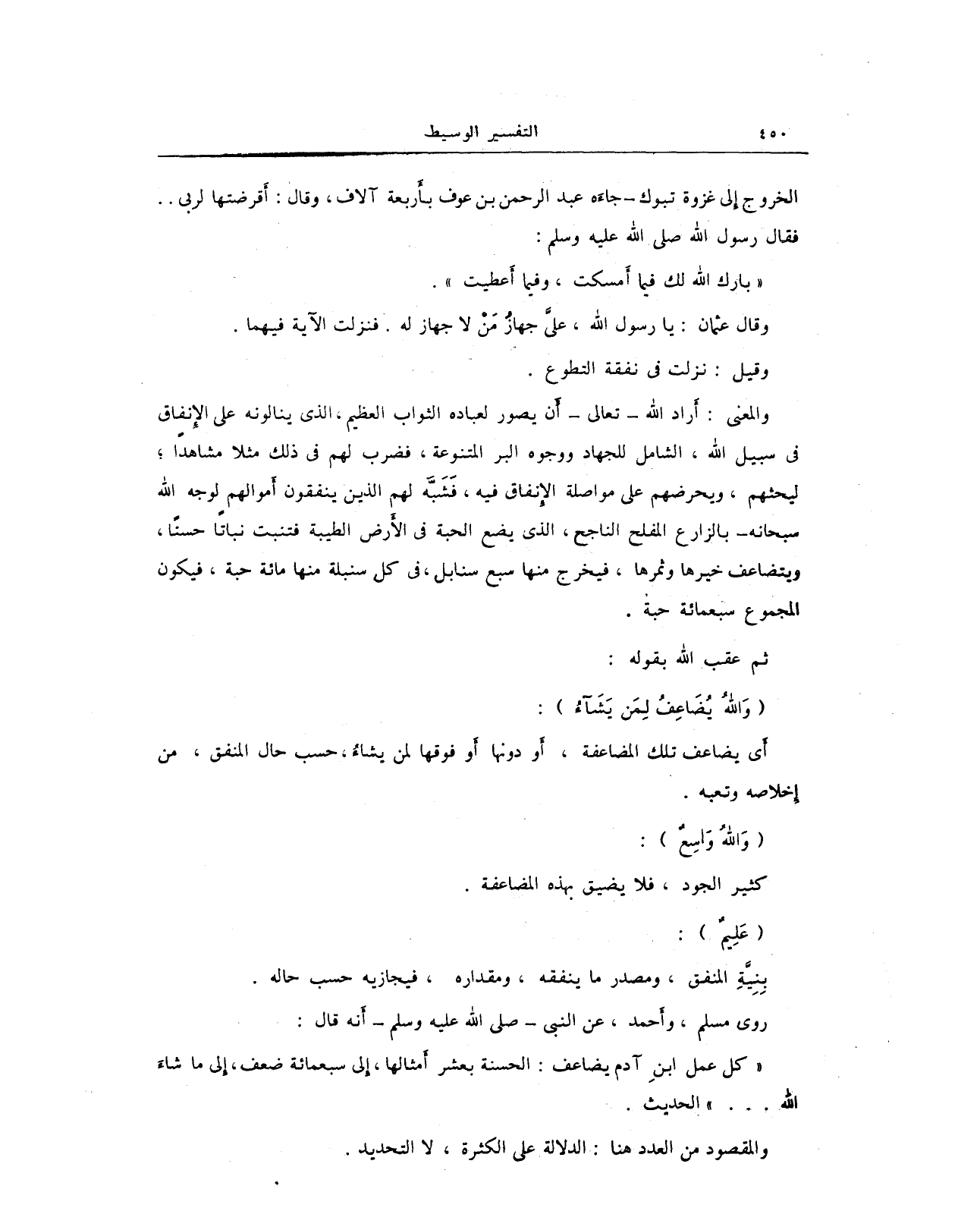 والمعنى: أراد الله - تعالى - أن يصور لعباده الثواب العظيم، الذي ينالونه على الإنفاق في سبيل الله، الشامل للجهاد ووجوه البر المتنوعة، فضرب لهم في ذلك مثلًا مشاهدًا، ليحثهم، ويحرضهم على مواصلة الإنفاق فيه، فَشَبَّه لهم الذين ينفقون أموالهم لوجه الله سبحانه - بالزارع المفلح الناجح، الذي يضع الحبة في الأرض الطيبة فتنبت نباتًا حسنًا، ويتضاعف خيرها وثمرها، فيخرج منها سبع سنابل، في كل سنبلة منها مائة حبة، فيكون المجموع سبعمائة حبة.
