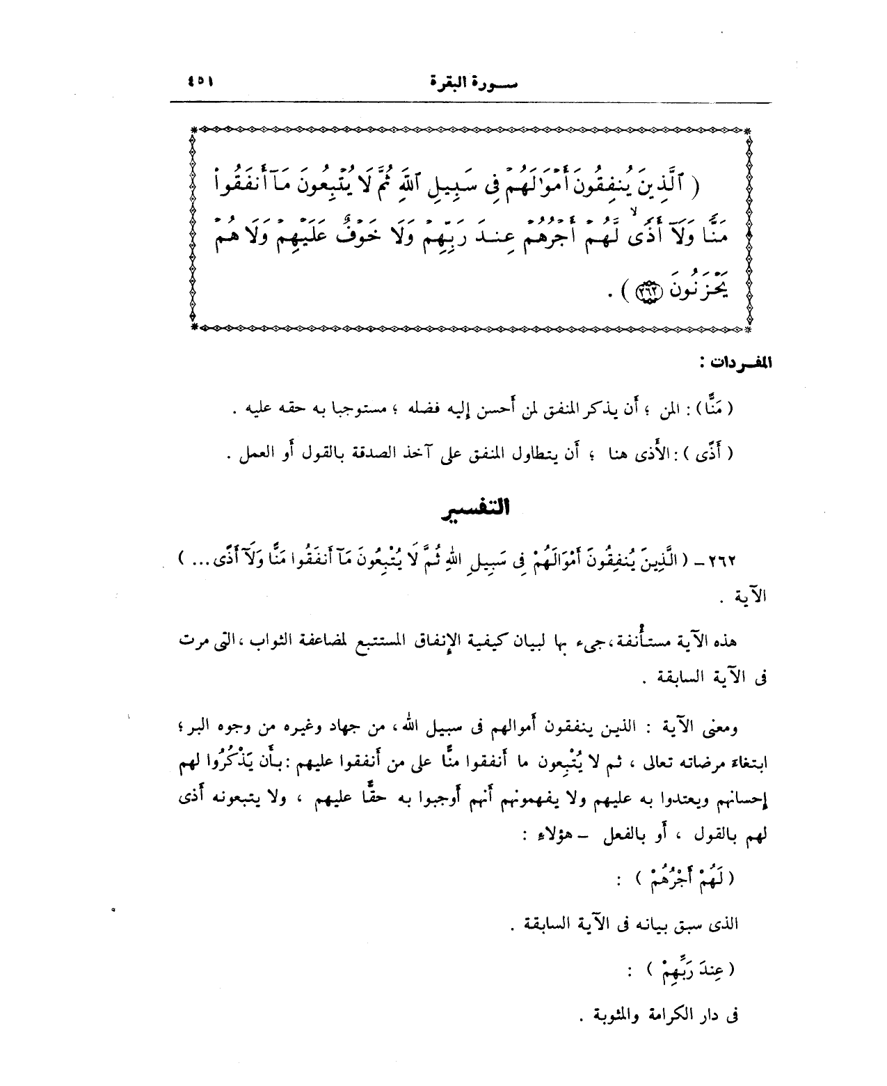 262 - {الَّذِينَ يُنفِقُونَ أَمْوَالَهُمْ فِي سَبِيلِ اللَّهِ ثُمَّ لَا يُتْبِعُونَ مَا أَنفَقُوا مَنًّا وَلَا أَذًى ... } الآية.