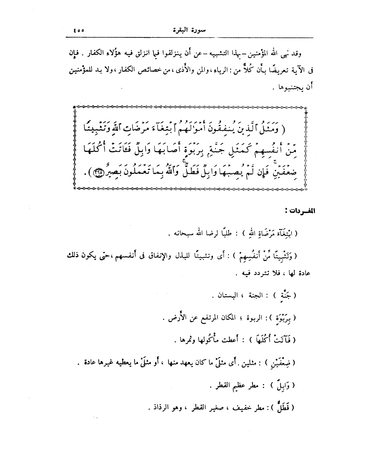 {وَمَثَلُ الَّذِينَ يُنْفِقُونَ أَمْوَالَهُمُ ابْتِغَاءَ مَرْضَاتِ اللَّهِ وَتَثْبِيتًا مِنْ أَنْفُسِهِمْ كَمَثَلِ جَنَّةٍ بِرَبْوَةٍ أَصَابَهَا وَابِلٌ فَآتَتْ أُكُلَهَا ضِعْفَيْنِ فَإِنْ لَمْ يُصِبْهَا وَابِلٌ فَطَلٌّ وَاللَّهُ بِمَا تَعْمَلُونَ بَصِيرٌ (265)}