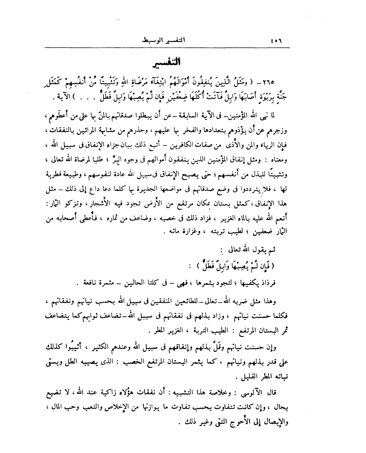 265 - {وَمَثَلُ الَّذِينَ يُنفِقُونَ أَمْوَالَهُمُ ابْتِغَاءَ مَرْضَاتِ اللَّهِ وَتَثْبِيتًا مِّنْأَنفُسِهِمْ كَمَثَلِ جَنَّةٍ بِرَبْوَةٍ أَصَابَهَا وَابِلٌ فَآتَتْ أُكُلَهَا ضِعْفَيْنِ فَإِن لَّمْيُصِبْهَا وَابِلٌ فَطَلٌّ ... } الآية.