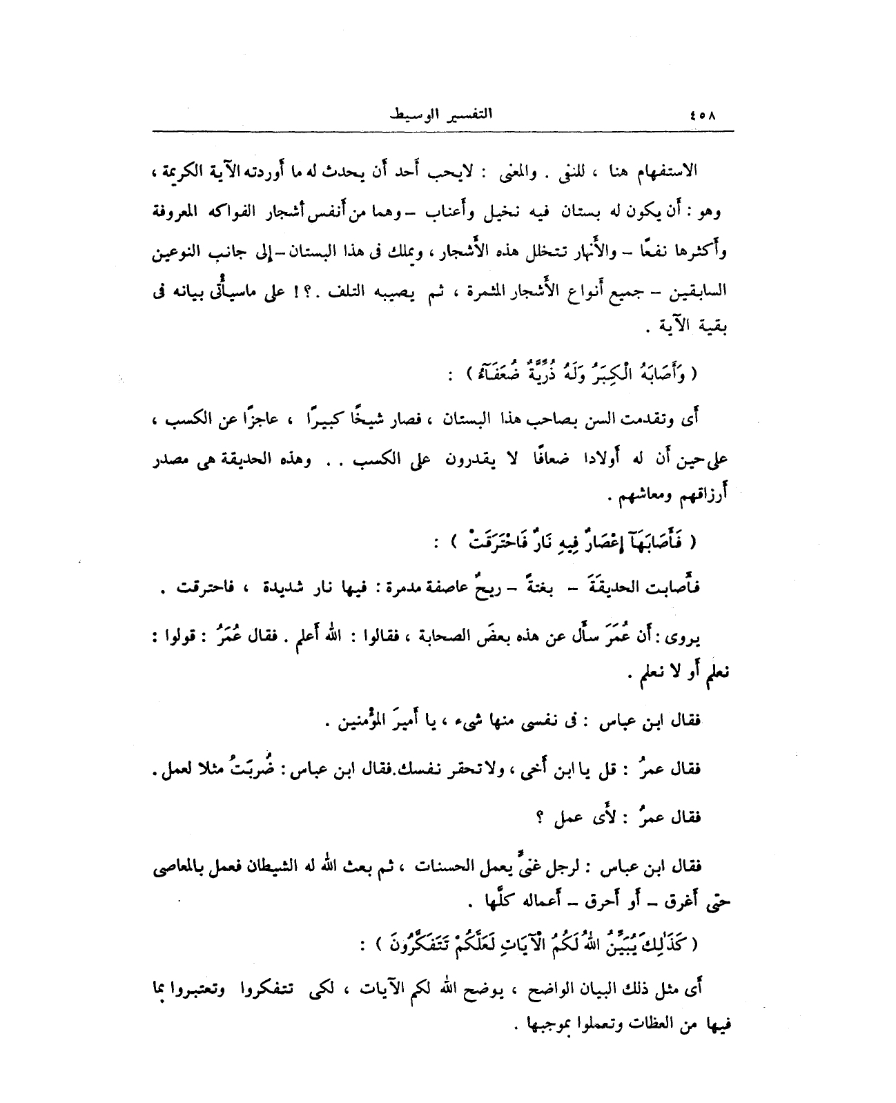 الاستفهام هنا، للنفي. والمعنى: لا يحب أحد أن يحدث له ما أوردته الآية الكريمة، وهو: أن يكون له بستان فيه نخيل وأعناب - وهما من أنفس أشجار الفواكه المعروفة وأكثرها نفعًا - والأنهار تتخلل هذه الأشجار، ويملك في هذا البستان - إلى جانب النوعين السابقين - جميع أنواع الأشجار المثمرة، ثم يصيبه التلف.؟! على ما سيأتي بيانه في بقية الآية.