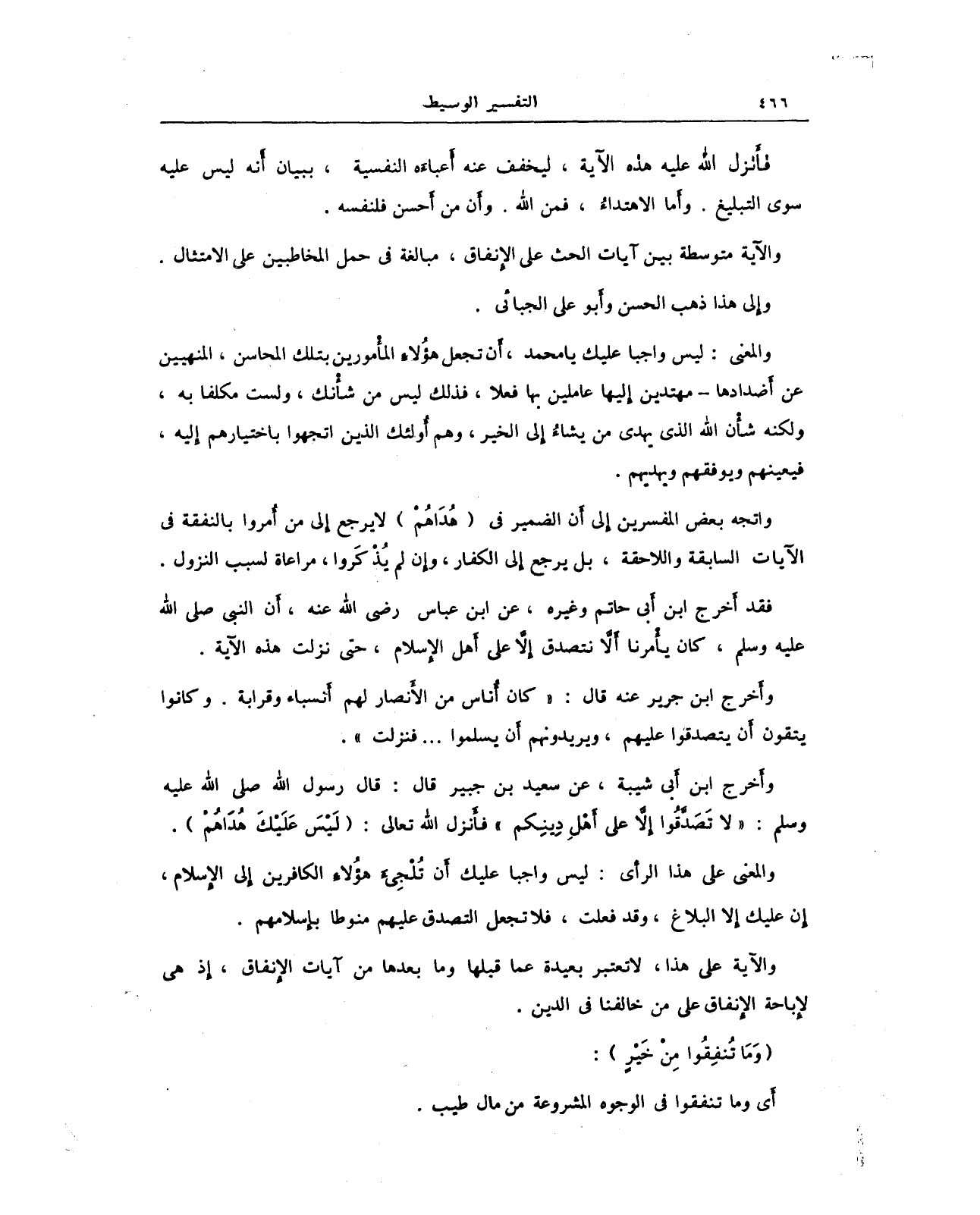 وأخرج ابن أبي شيبة، عن سعيد بن جبير قال: قال رسول الله صلى الله عليه وسلم: "لا تَصَدَّقُوا إلَّا على أَهْلِ دِينِكم" فأنزل الله تعالى: {لَيْسَ عَلَيْكَ هُدَاهُمْ}.