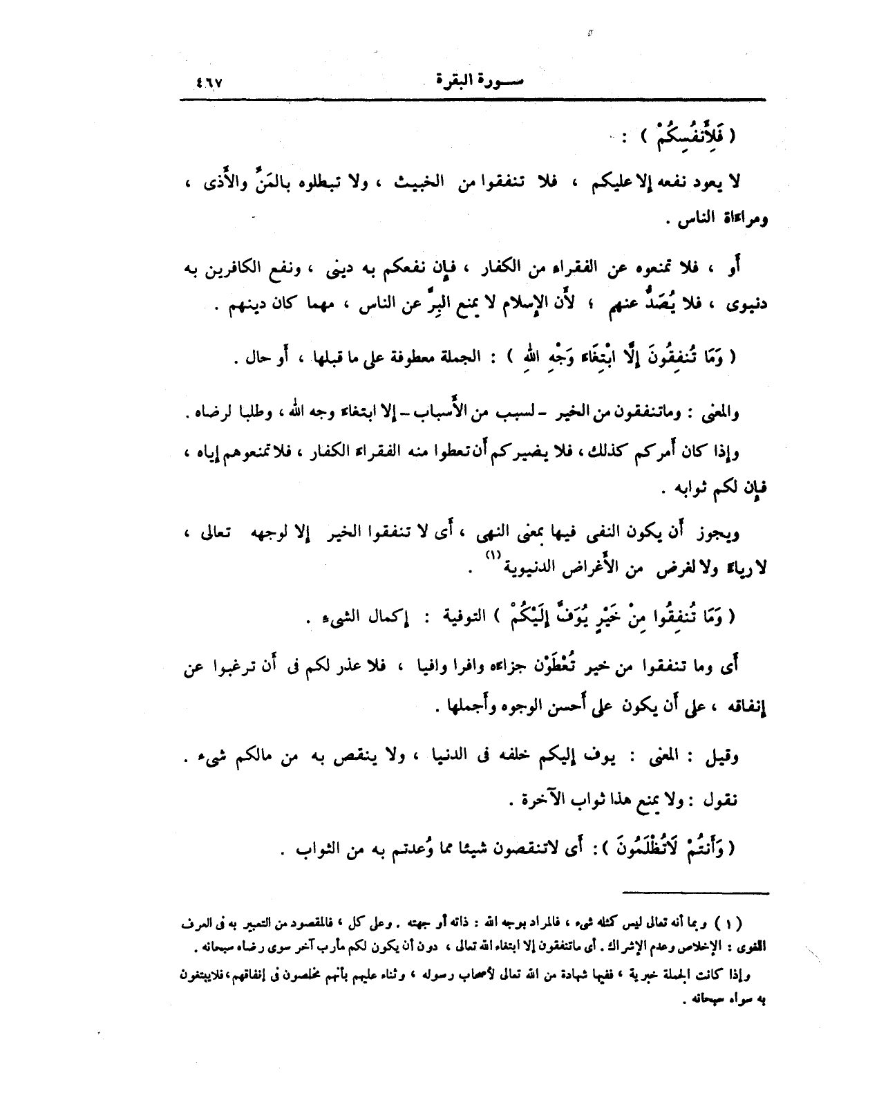والمعنى: وما تنفقون من الخير - لسبب من الأسباب - إلا ابتغاء وجه الله، وطلبا لرضاه. وإذا كان أمركم كذلك، فلا يضيركم أن تعطوا منه الفقراء الكفار، فلا تمنعوهم إياه، فإن لكم ثوابه.