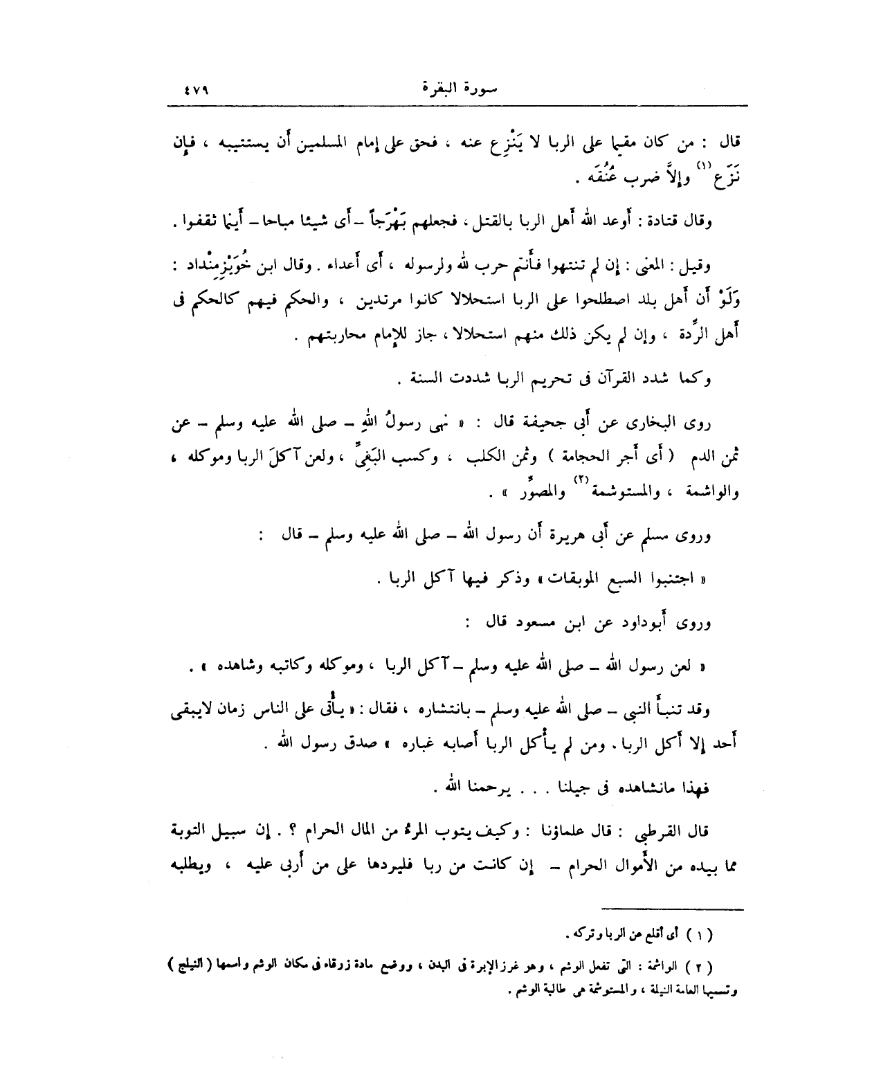وقيل: المعنى: إن لم تنتهوا فأنتم حرب لله ولرسوله، أي أعداء. وقال ابن خُوَيْبِزِمنْداد: وَلَوْ أَن أهل بلد اصطلحوا على الربا استحلالًا كانوا مرتدين، والحكم فيهم كالحكم في أهل الرِّدة، وإن لم يكن ذلك منهم استحلالًا، جاز للإمام محاربتهم.