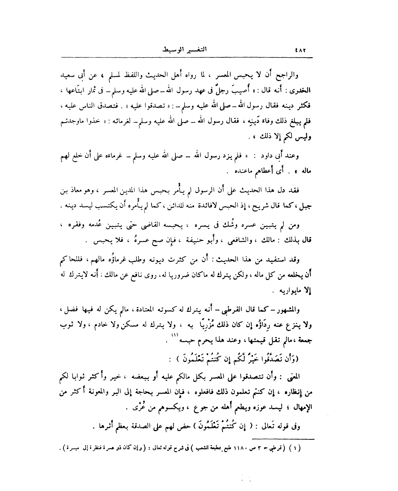 (¬1) (قرطبي جـ 3 ص 1180 طبع بمطبعة الشعب) في شرح قوله تعالى: (وإن كان ذو عسرة فنظرة إلى ميسرة).