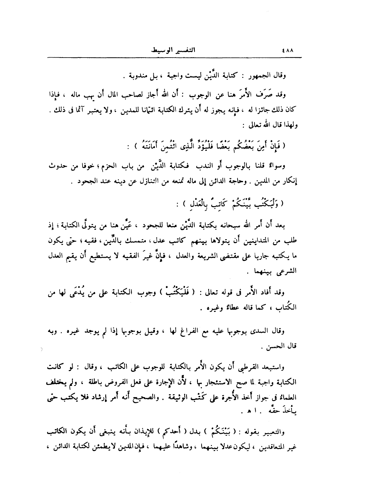 واستبعد القرطبي أن يكون الأمر بالكتابة للوجوب على الكاتب، وقال: لو كانت الكتابة واجبة لما صح الاستئجار بها، لأن الإجارة على فعل الفروض باطلة، ولم يختلف العلماءُ في جواز أخذ الأُجرة على كَتْب الوثيقة. والصحيح أنه أمر إرشاد فلا يكتب حتى يأخذَ حقَّه. اهـ.