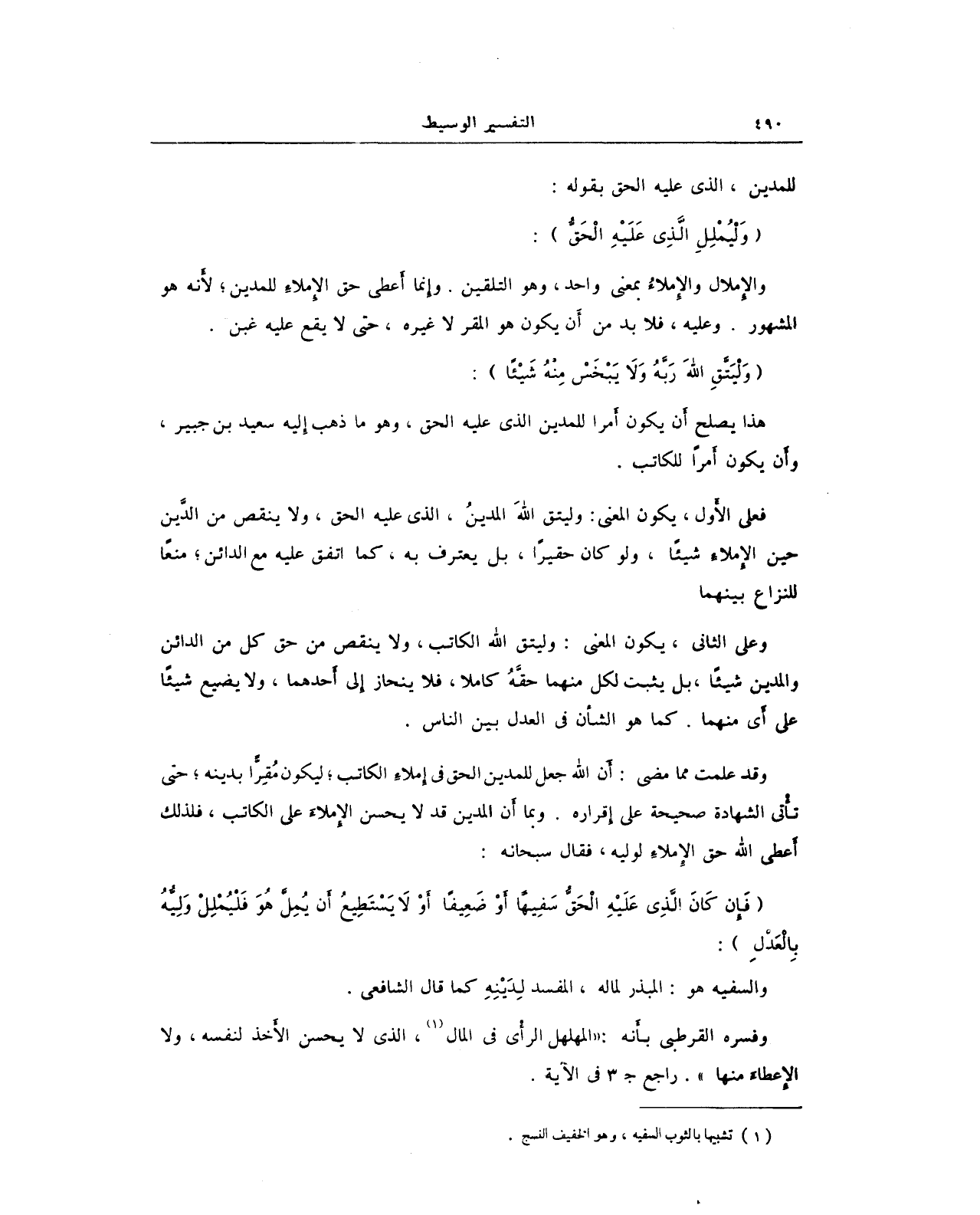 فعلى الأول، يكون المعنى: وليتق اللهَ المدينُ، الذي عليه الحق، ولا ينقص من الدين حين الإملاء شيئًا، ولم كان حقيرًا، بل يعترف به، كما اتفق عليه مع الدائن؛ منعًا للنزاع بينهما.