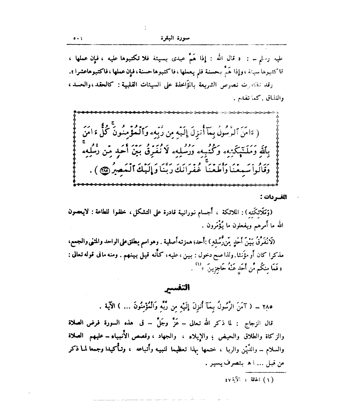 {آمَنَ الرَّسُولُ بِمَا أُنْزِلَ إِلَيْهِ مِنْ رَبِّهِ وَالْمُؤْمِنُونَ كُلٌّ آمَنَ بِاللَّهِ وَمَلَائِكَتِهِ وَكُتُبِهِ وَرُسُلِهِ لَا نُفَرِّقُ بَيْنَ أَحَدٍ مِنْ رُسُلِهِ وَقَالُوا سَمِعْنَا وَأَطَعْنَا غُفْرَانَكَ رَبَّنَا وَإِلَيْكَ الْمَصِيرُ (285)}