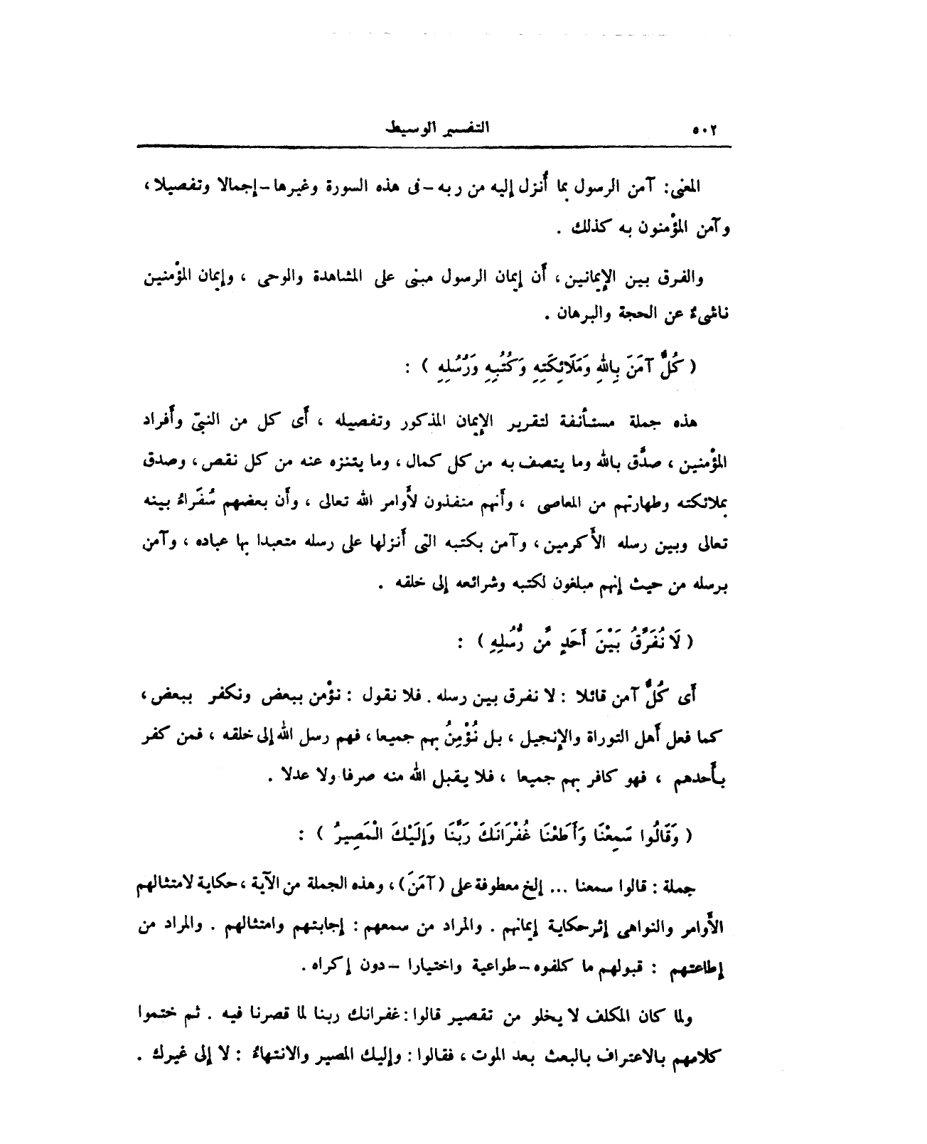 والمعنى: آمن الرسول بما أُنزل إليه من ربه - في هذه السورة وغيرها - إجمالًا وتفصيلًا، وآمن المؤمنون به كذلك.