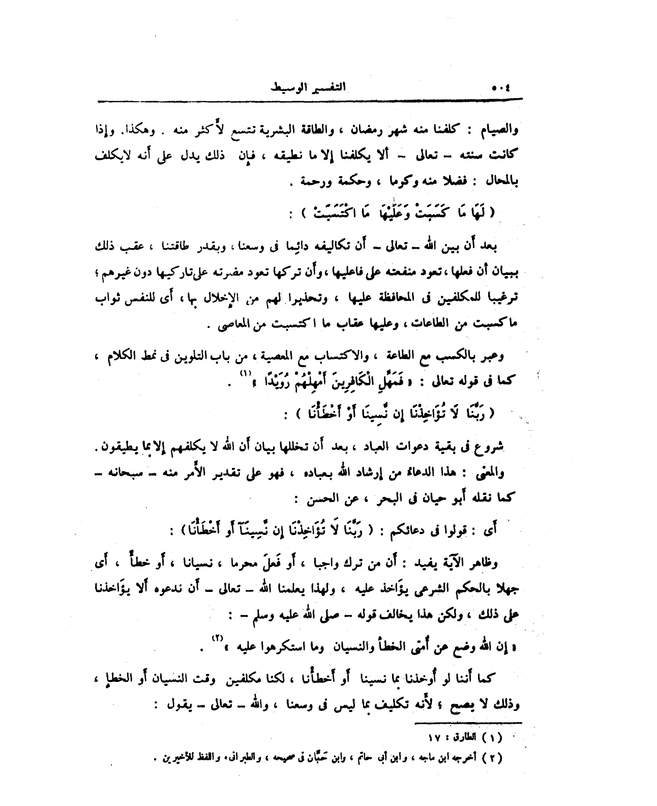 والصيام: كلفنا منه شهر رمضان، والطاقة البشرية تتسع لأكثر منه. وهكذا. وإذا كانت سنته - تعالى - ألا يكلفنا إلا ما نطيقه، فإن ذلك يدل على أنه لا ي4كلف بالمحال: فضلا منه وكرم، وحكمة ورحمة.