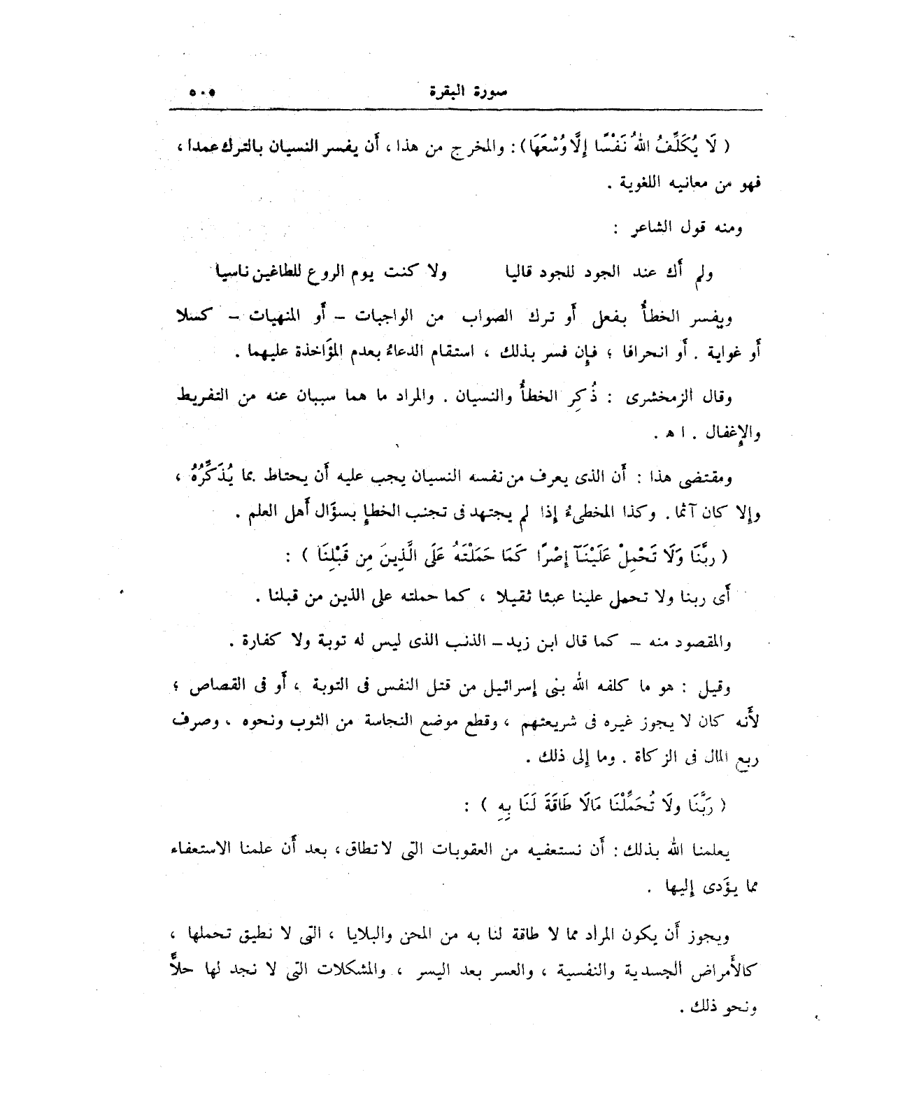 (لَا يُكَلِّفُ اللَّهُ نَفْسًا إِلَّا وُسْعَهَا): والمخرج من هذا، أن يفسر النسيان بالترك عمدًا، فهو من معانيه اللغوية.