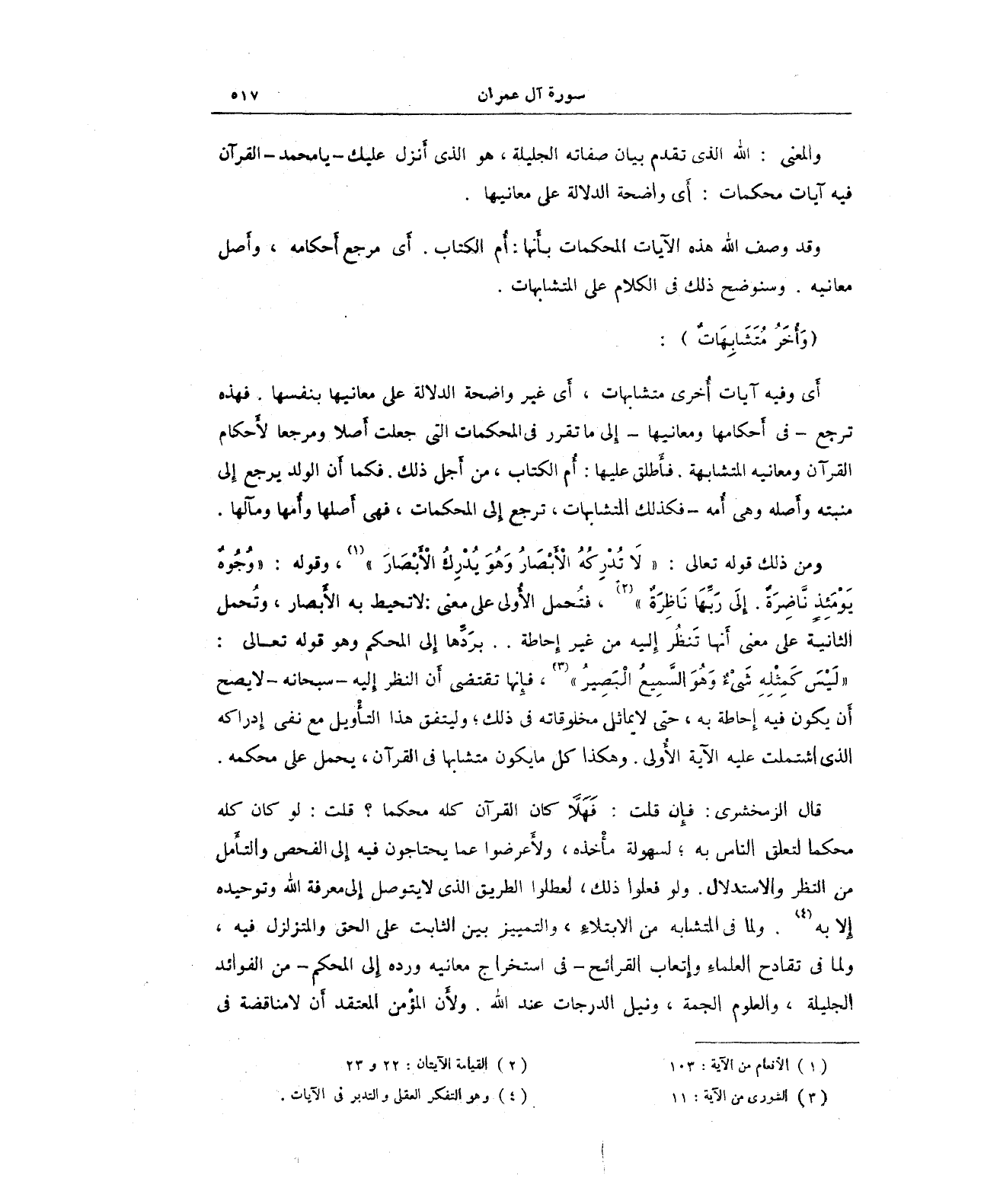 وقد وصف الله هذه الآيات المحكمات بأنها: أُم الكتاب. أي مرجع أحكامه، وأصل معانيه. وسنوضح ذلك في الكلام على المتشابهات.
