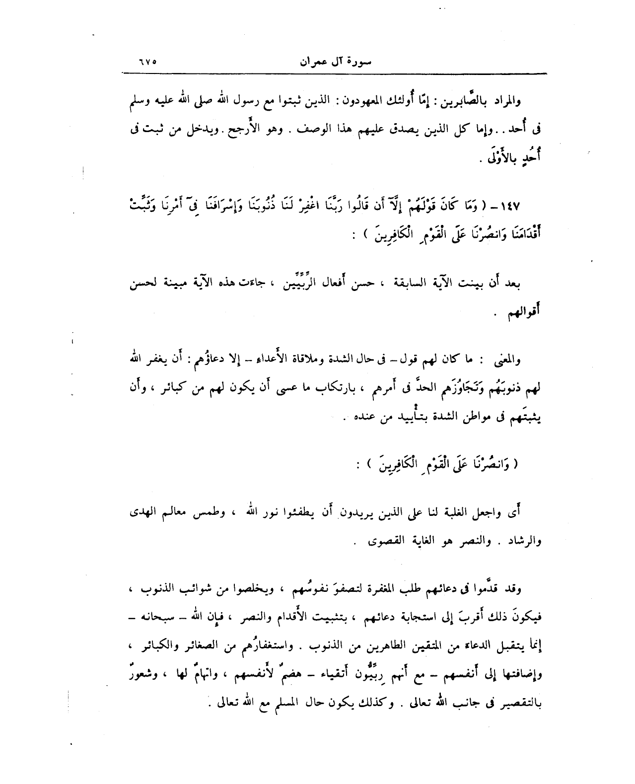 147 - {وَمَا كَانَ قَوْلَهُمْ إِلَّا أَنْ قَالُوا رَبَّنَا اغْفِرْ لَنَا ذُنُوبَنَا وَإِسْرَافَنَا فِي أَمْرِنَا وَثَبِّتْ أَقْدَامَنَا وَانْصُرْنَا عَلَى الْقَوْمِ الْكَافِرِينَ}: