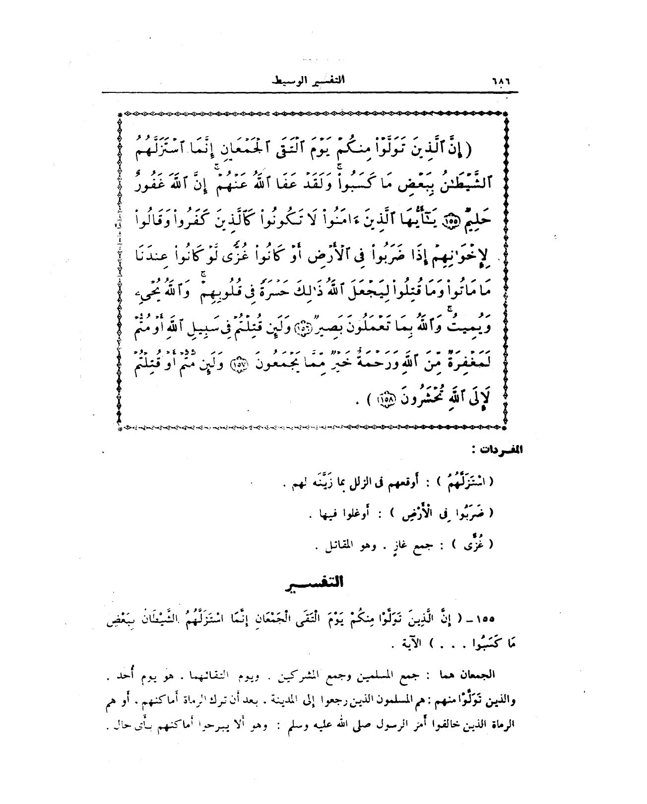 {إِنَّ الَّذِينَ تَوَلَّوْا مِنْكُمْ يَوْمَ الْتَقَى الْجَمْعَانِ إِنَّمَا اسْتَزَلَّهُمُ الشَّيْطَانُ بِبَعْضِ مَا كَسَبُوا وَلَقَدْ عَفَا اللَّهُ عَنْهُمْ إِنَّ اللَّهَ غَفُورٌ حَلِيمٌ (155) يَا أَيُّهَا الَّذِينَ آمَنُوا لَا تَكُونُوا كَالَّذِينَ كَفَرُوا وَقَالُوا لِإِخْوَانِهِمْ إِذَا ضَرَبُوا فِي الْأَرْضِ أَوْ كَانُوا غُزًّى لَوْ كَانُوا عِنْدَنَا مَا مَاتُوا وَمَا قُتِلُوا لِيَجْعَلَ اللَّهُ ذَلِكَ حَسْرَةً فِي قُلُوبِهِمْ وَاللَّهُ يُحْيِي وَيُمِيتُ وَاللَّهُ بِمَا تَعْمَلُونَ بَصِيرٌ (156) وَلَئِنْ قُتِلْتُمْ فِي سَبِيلِ اللَّهِ أَوْ مُتُّمْ لَمَغْفِرَةٌ مِنَ اللَّهِ وَرَحْمَةٌ خَيْرٌ مِمَّا يَجْمَعُونَ (157) وَلَئِنْ مُتُّمْ أَوْ قُتِلْتُمْ لَإِلَى اللَّهِ تُحْشَرُونَ (158)}