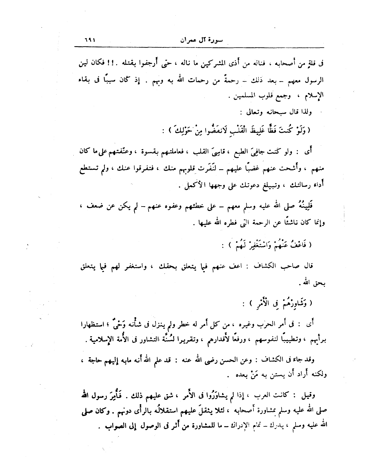 وقيل: كانت العرب، إذا لم يشاوروا في الأمر، شق عليهم ذلك. فأمر رسول الله - صلى الله عليه وسلم - بمشاورة أصحابه، لئلا يثقل عليهم استقلالُه بالرأي دونهم. وكان - صلى الله عليه وسلم -، يدرك - تمام الإدراك - ما للمشاورة من أثر في الوصول إلى الصواب.
