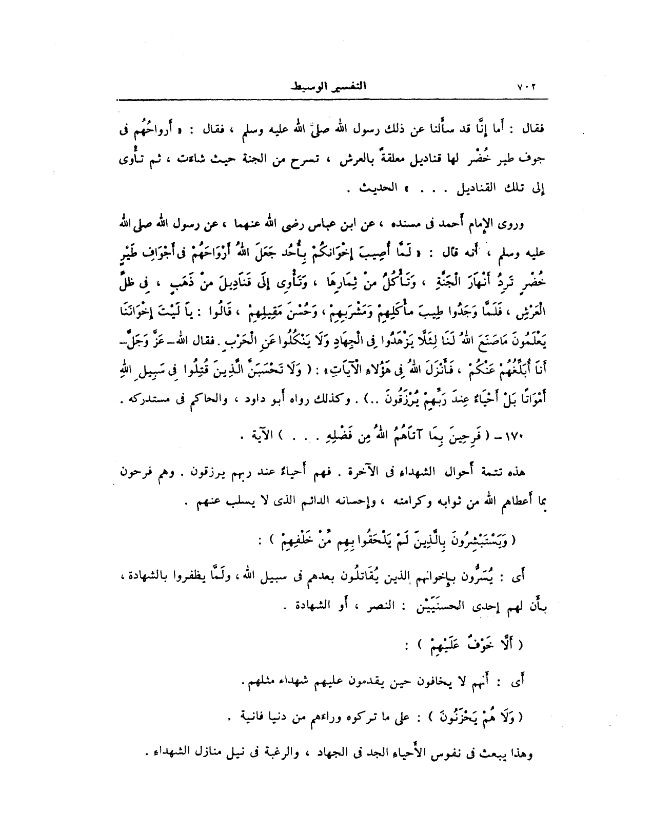وروى الإمام أحمد في مسنده، عن ابن عباس رضي الله عنهما، عن رسول الله - صلى الله عليه وسلم -، أنه قال: "لما أصيب إخوانكم بأحد جعل الله أرواحهم في أجواف طير خضر ترد أنهار الجنة، وتأكل من ثمارها، وتأوي إلى قناديل من ذهبٍ، في ظل العرش، فلما وجدوا طيب مأكلهم ومشربهم، وحسن مقيلهم، قالوا: يا ليت إخواننا يعلمون ما صنع الله لنا لئلا يزهدوا في الجهاد ولا ينكلوا عن الحرب. فقال الله: - عز وجل - أنا أبلغهم عنكم، فأنزل الله في هؤلاء الآيات": {وَلَا تَحْسَبَنَّ الَّذِينَ قُتِلُوا فِي سَبِيلِ اللَّهِ أَمْوَاتًا بَلْ أَحْيَاءٌ عِنْدَ رَبِّهِمْ يُرْزَقُونَ ... }. وكذلك رواه أبو داود، والحاكم في مستدركه.