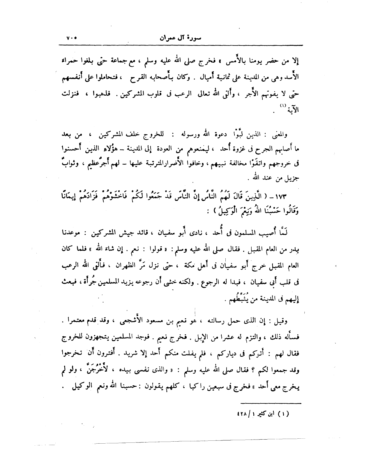 إلا من حضر يومنا بالأمس" فخرج - صلى الله عليه وسلم -، مع جماعة حتى بلغوا حمراء الأسد وهي من المدينة على ثمانية أميال. وكان بأصحابه القرح، فتحاملوا على أنفسهم حتى يفوتهم الأجر، وألقى الله تعالى الرعب في قلوب المشركين. فذهبوا، فنزلت الآية (¬1).