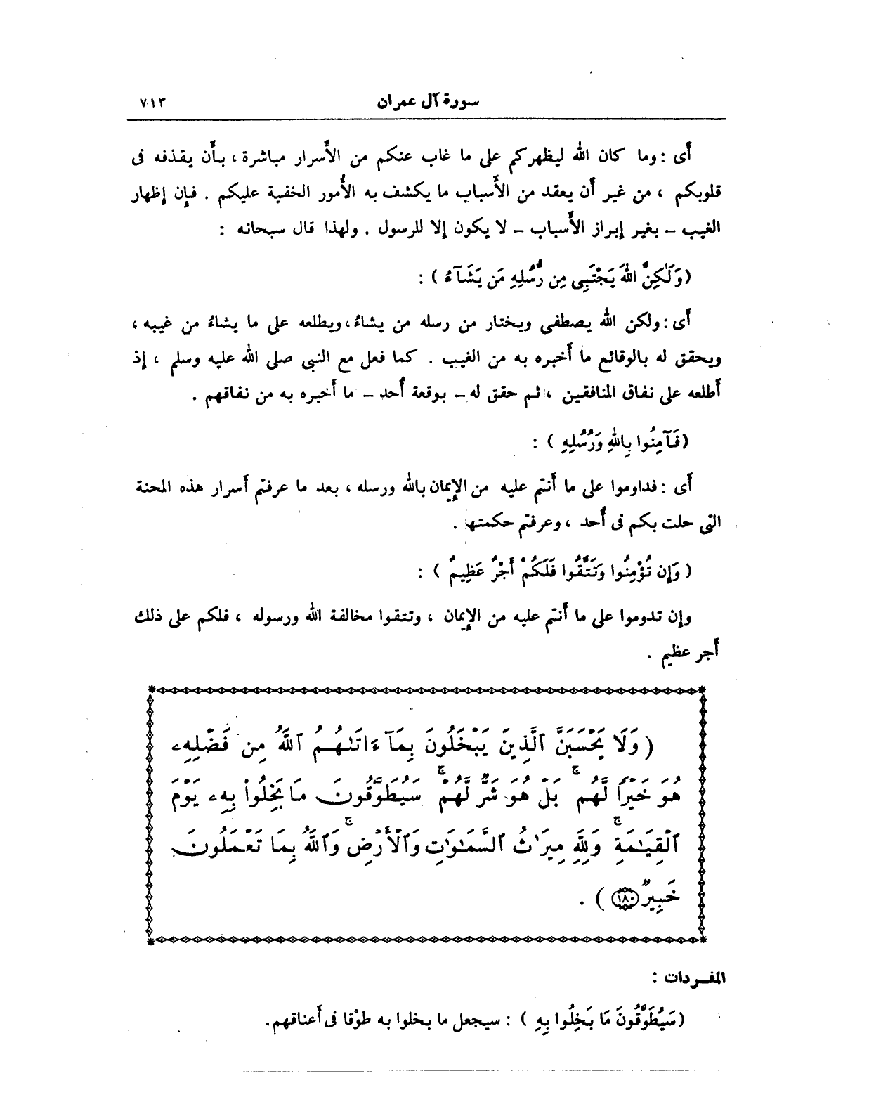 {وَلَا يَحْسَبَنَّ الَّذِينَ يَبْخَلُونَ بِمَا آتَاهُمُ اللَّهُ مِنْ فَضْلِهِ هُوَ خَيْرًا لَهُمْ بَلْ هُوَ شَرٌّ لَهُمْ سَيُطَوَّقُونَ مَا بَخِلُوا بِهِ يَوْمَ الْقِيَامَةِ وَلِلَّهِ مِيرَاثُ السَّمَاوَاتِ وَالْأَرْضِ وَاللَّهُ بِمَا تَعْمَلُونَ خَبِيرٌ (180)}.
