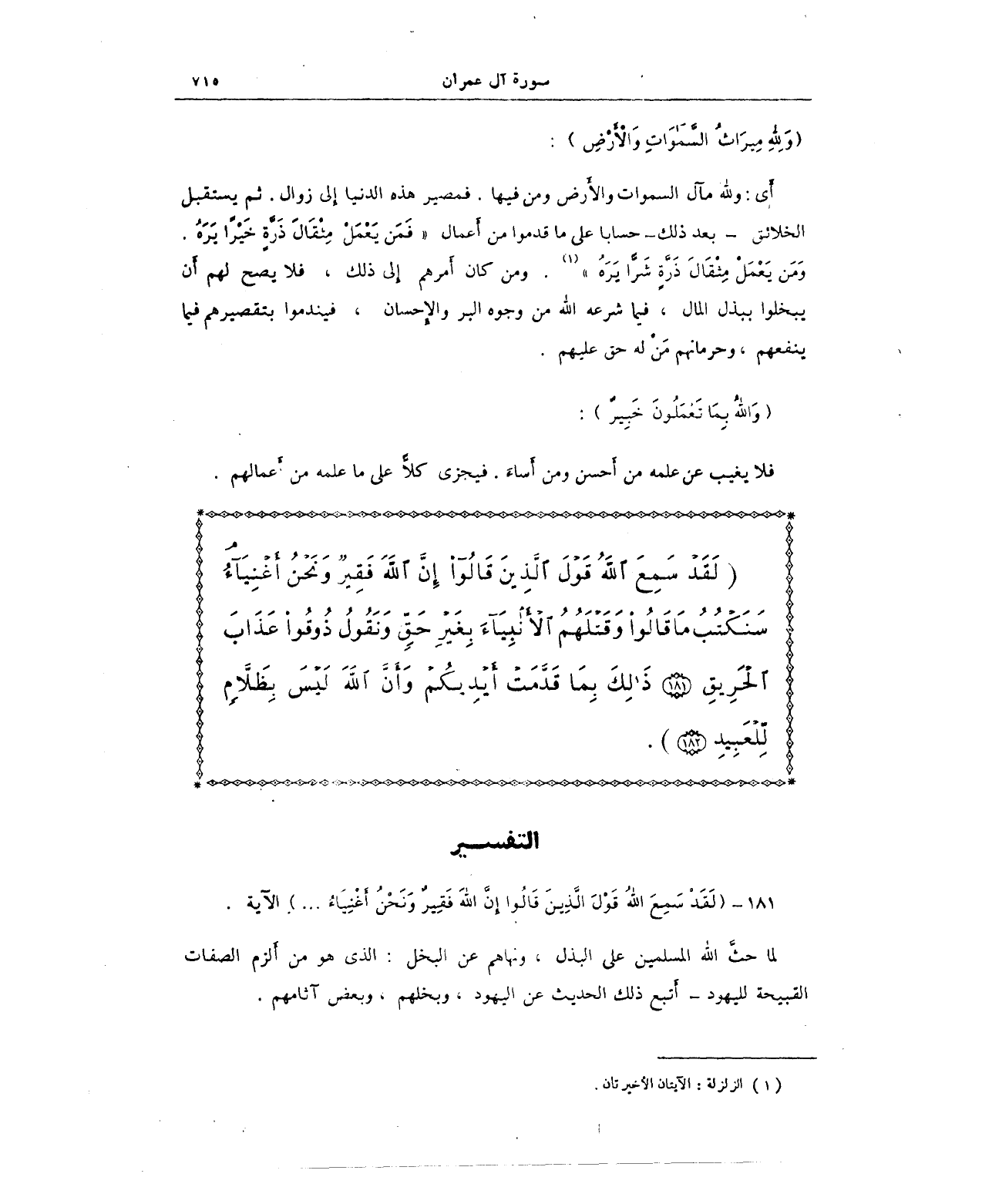 181 - {لَقَدْ سَمِعَ اللَّهُ قَوْلَ الَّذِينَ قَالُوا إِنَّ اللَّهَ فَقِيرٌ وَنَحْنُ أَغْنِيَاءُ ... } الآية.