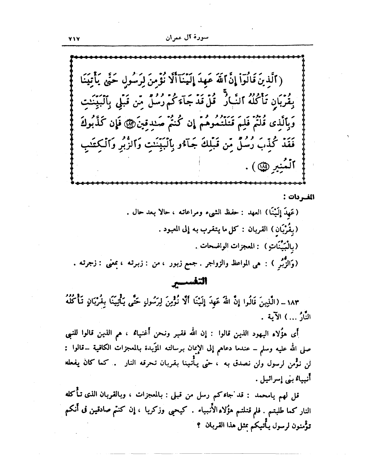 {الَّذِينَ قَالُوا إِنَّ اللَّهَ عَهِدَ إِلَيْنَا أَلَّا نُؤْمِنَ لِرَسُولٍ حَتَّى يَأْتِيَنَا بِقُرْبَانٍ تَأْكُلُهُ النَّارُ قُلْ قَدْ جَاءَكُمْ رُسُلٌ مِنْ قَبْلِي بِالْبَيِّنَاتِ وَبِالَّذِي قُلْتُمْ فَلِمَ قَتَلْتُمُوهُمْ إِنْ كُنْتُمْ صَادِقِينَ (183) فَإِنْ كَذَّبُوكَ فَقَدْ كُذِّبَ رُسُلٌ مِنْ قَبْلِكَ جَاءُوا بِالْبَيِّنَاتِ وَالزُّبُرِ وَالْكِتَابِ الْمُنِيرِ (184)}.