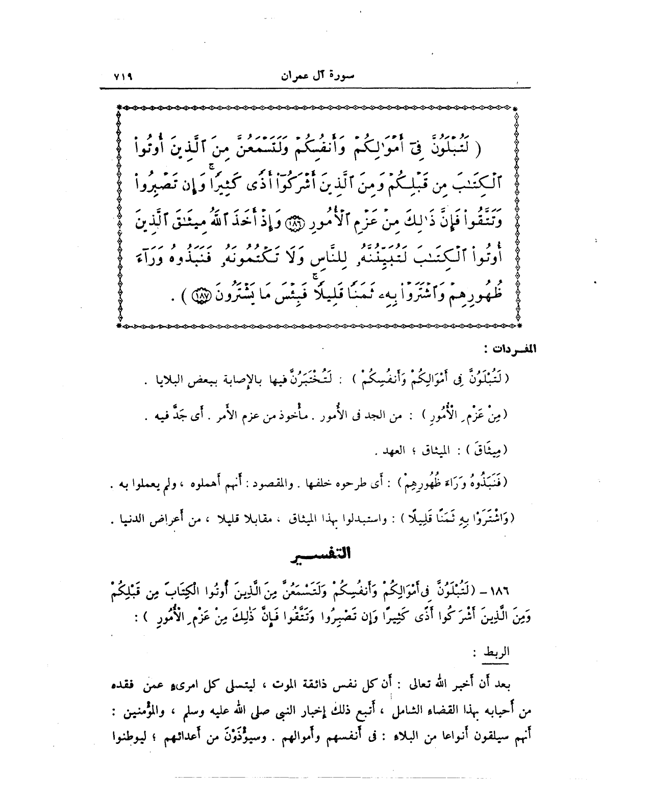 {لَتُبْلَوُنَّ فِي أَمْوَالِكُمْ وَأَنْفُسِكُمْ وَلَتَسْمَعُنَّ مِنَ الَّذِينَ أُوتُوا الْكِتَابَ مِنْ قَبْلِكُمْ وَمِنَ الَّذِينَ أَشْرَكُوا أَذًى كَثِيرًا وَإِنْ تَصْبِرُوا وَتَتَّقُوا فَإِنَّ ذَلِكَ مِنْ عَزْمِ الْأُمُورِ (186) وَإِذْ أَخَذَ اللَّهُ مِيثَاقَ الَّذِينَ أُوتُوا الْكِتَابَ لَتُبَيِّنُنَّهُ لِلنَّاسِ وَلَا تَكْتُمُونَهُ فَنَبَذُوهُ وَرَاءَ ظُهُورِهِمْ وَاشْتَرَوْا بِهِ ثَمَنًا قَلِيلًا فَبِئْسَ مَا يَشْتَرُونَ (187)}.