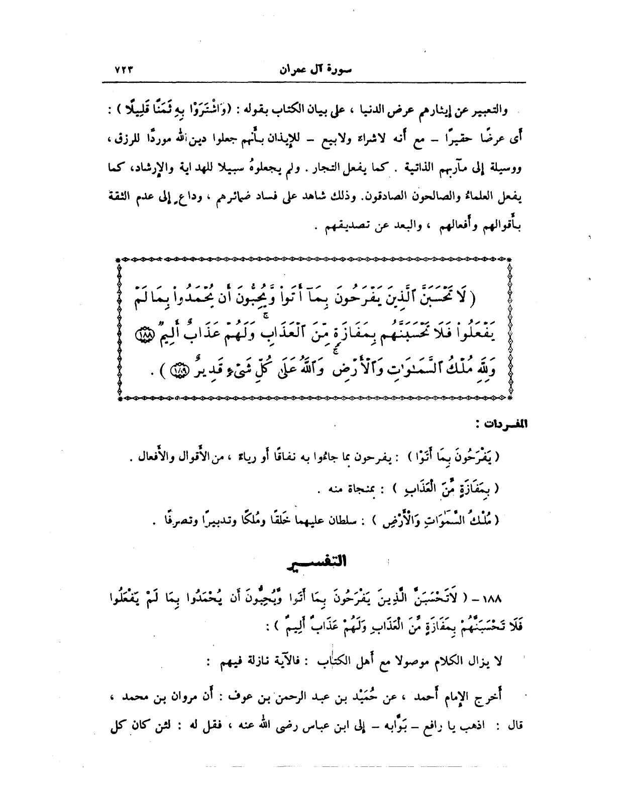 {لَا تَحْسَبَنَّ الَّذِينَ يَفْرَحُونَ بِمَا أَتَوْا وَيُحِبُّونَ أَنْ يُحْمَدُوا بِمَا لَمْ يَفْعَلُوا فَلَا تَحْسَبَنَّهُمْ بِمَفَازَةٍ مِنَ الْعَذَابِ وَلَهُمْ عَذَابٌ أَلِيمٌ (188) وَلِلَّهِ مُلْكُ السَّمَاوَاتِ وَالْأَرْضِ وَاللَّهُ عَلَى كُلِّ شَيْءٍ قَدِيرٌ (189)}.