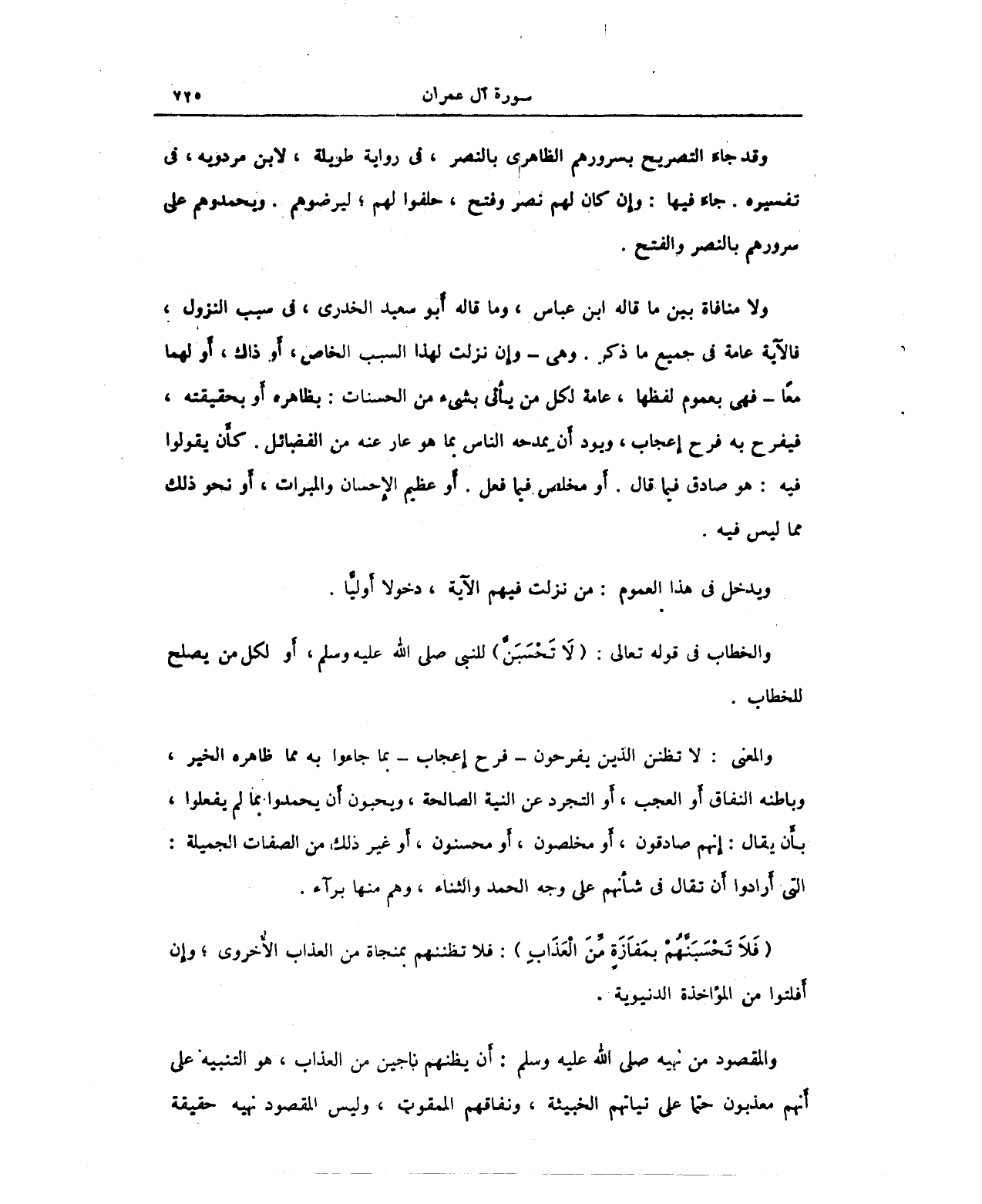 ولا منافاة ببن ما قاله ابن عباس، وما قاله أبو سعيد الخدري، في سبب النزول، فالآية عامة في جميع ما ذكر. وهي - وإن نزلت لهدا السبب الخاص، أو ذاك، أو لهما معًا - فهي بعموم لفظها، عامة لكل من يأتي بشي من الحسنات: بظاهره أو بحقيقته، فيفرح به فرح إعجاب، ويود أن يمدحه الناس بما هو عار عنه من الفضائل. كأن يقولوا فيه: هو صادق فيما قال. أو مخلص. فما فعل. أو عظيم الإحسان والمبرات، أو نحو ذلك مما ليس فيه.