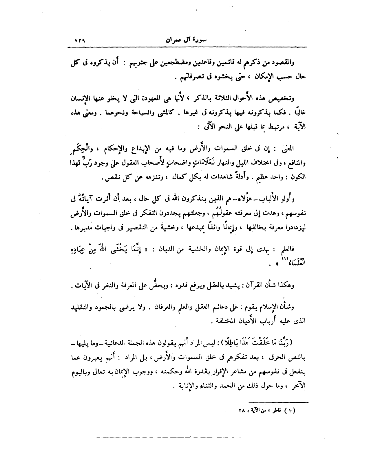 وأولو الألباب - هؤلاء - هم الذين يتذكرون الله في كل حال، بعد أن أثرت آياته في نفوسهم، وهدت إلى معرفته عقولُهُم، وجعلتهم يجددون التفكر في خلق السموات والأرض ليزدادوا معرفة بخالقها، وإيمانًا واثقًا بمبدعها، وخشية من التقصير في واجبات مدبرها.