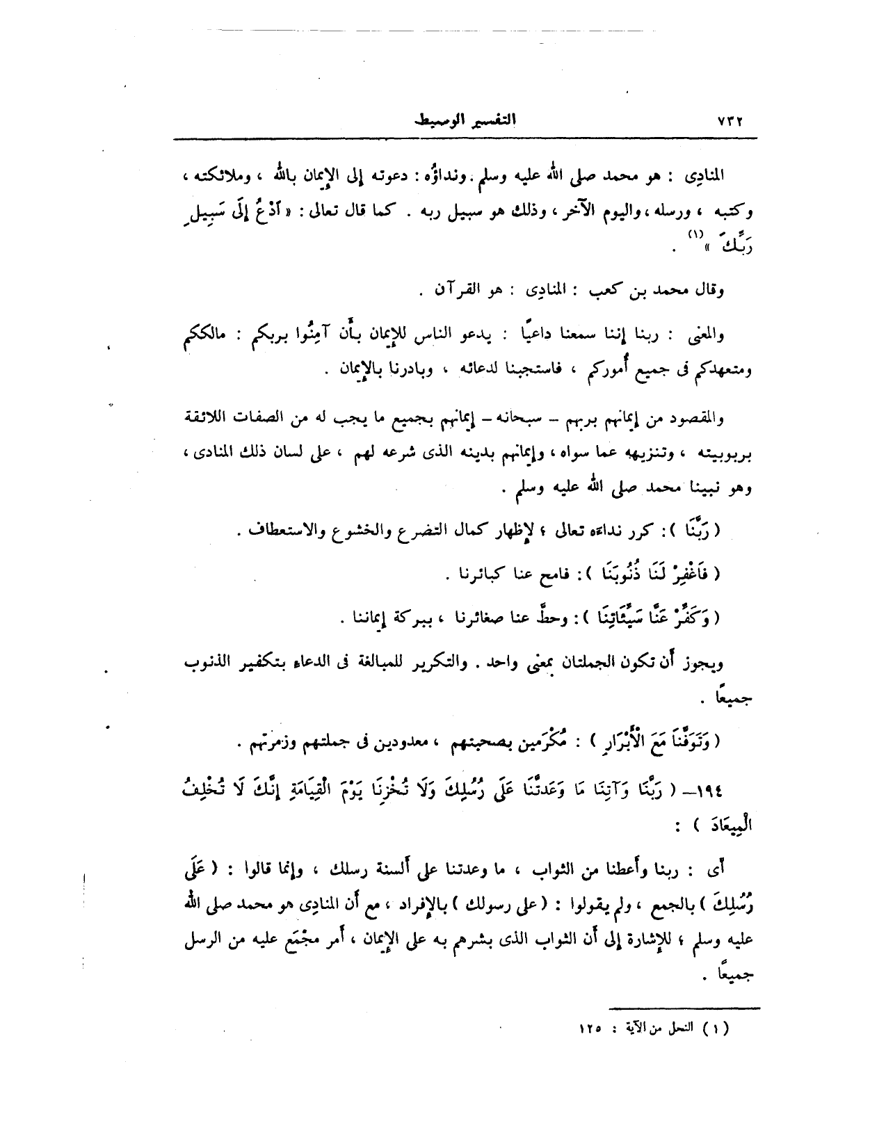 المنادِى: هو محمَّد صلى الله عليه وسلم. ونداؤُه: دعوته إلى الإيمان بالله، وملائكته، وكتبه، ورسله، واليوم الآخر، وذلك هو سبيل ربه. كما قال تعالى: {ادْعُ إِلَى سَبِيلِ رَبِّكَ} (¬1).