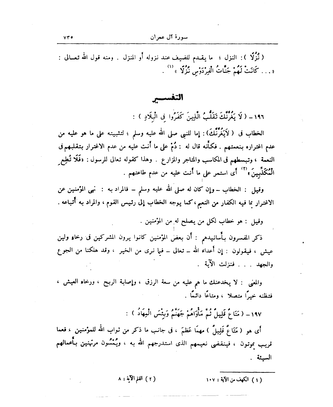 الخطاب في {لَا يَغُرَّنَّكَ}: إما للنبي صلى الله عليه وسلم؛ لتثبيته على ما هو عليه من عدم اغتراره بنعمتهم. فكأنه قال له: دُمْ على ما أنت عليه من عدم الاغترار بتقلبهم في النعمة، وتبسطهم في المكاسب والمتاجر والمزارع. وهذا كقوله تعالى للرسول: {فَلَا تُطِع المُكَذِّبِينَ} (¬2) أي استمر على ما أنت عليه من عدم طاعتهم.