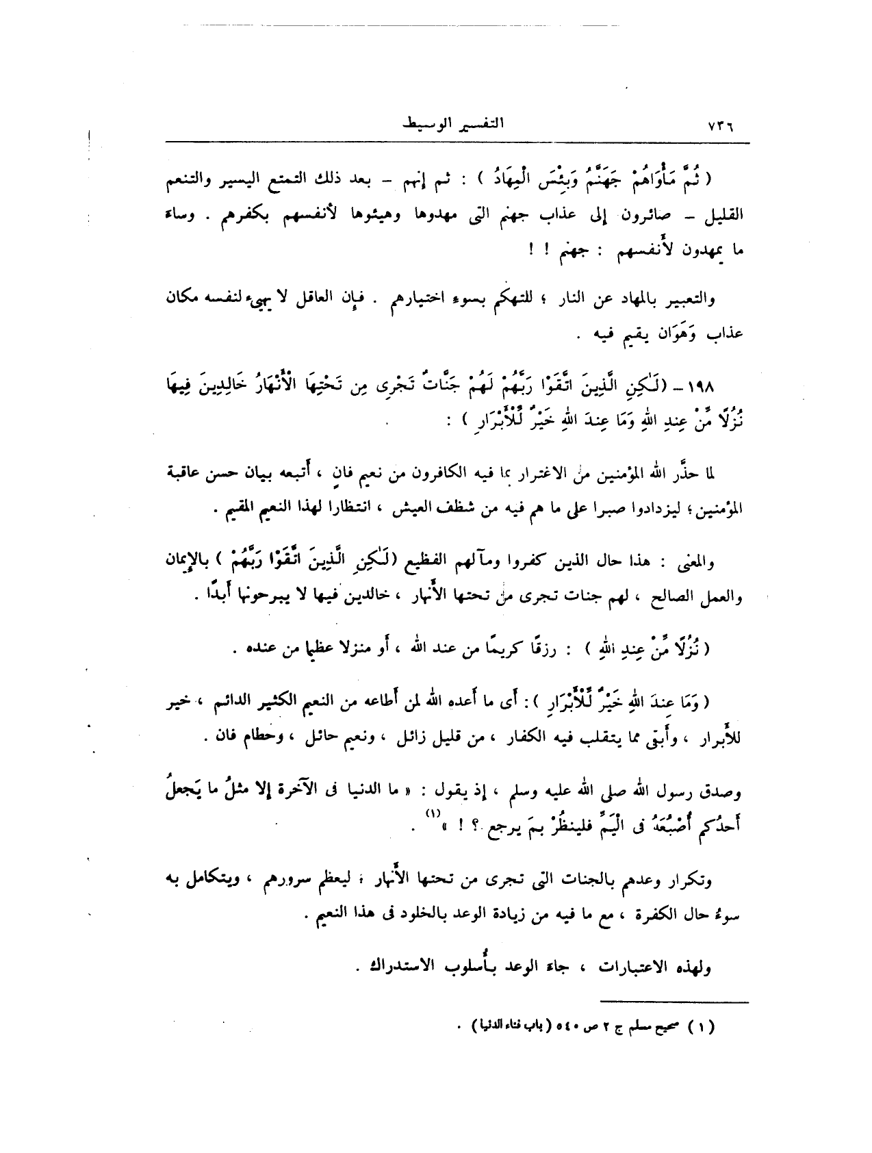 لما حذَّر الله المؤمنين من الاغترار بما فيه الكافرون من نعيم فانٍ، أتبعه بيان حسن عاقبة المؤمنين، ليزدادوا صبرا على ما هم فيه من شظف العيش، انتظارا لهذا النعيم المقيم.