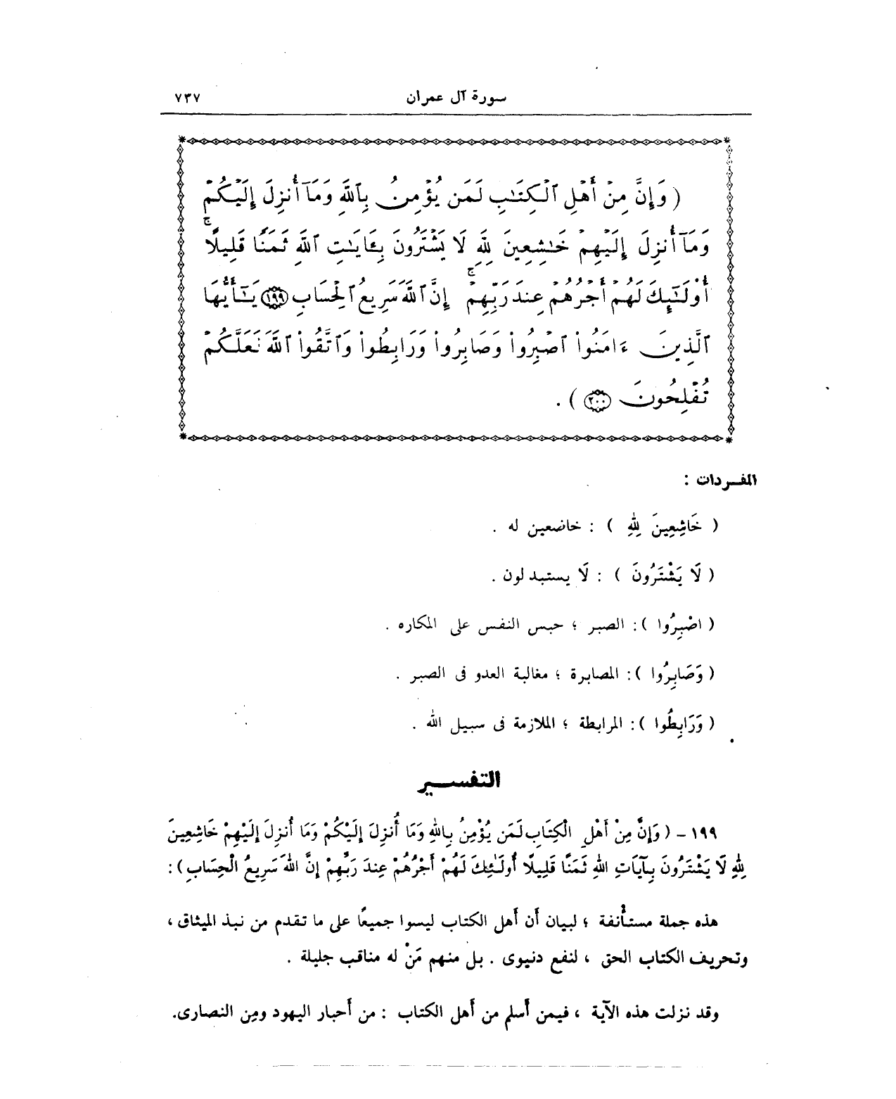 {وَإِنَّ مِنْ أَهْلِ الْكِتَابِ لَمَنْ يُؤْمِنُ بِاللَّهِ وَمَا أُنْزِلَ إِلَيْكُمْ وَمَا أُنْزِلَ إِلَيْهِمْ خَاشِعِينَ لِلَّهِ لَا يَشْتَرُونَ بِآيَاتِ اللَّهِ ثَمَنًا قَلِيلًا أُولَئِكَ لَهُمْ أَجْرُهُمْ عِنْدَ رَبِّهِمْ إِنَّ اللَّهَ سَرِيعُ الْحِسَابِ (199) يَا أَيُّهَا الَّذِينَ آمَنُوا اصْبِرُوا وَصَابِرُوا وَرَابِطُوا وَاتَّقُوا اللَّهَ لَعَلَّكُمْ تُفْلِحُونَ (200)}.