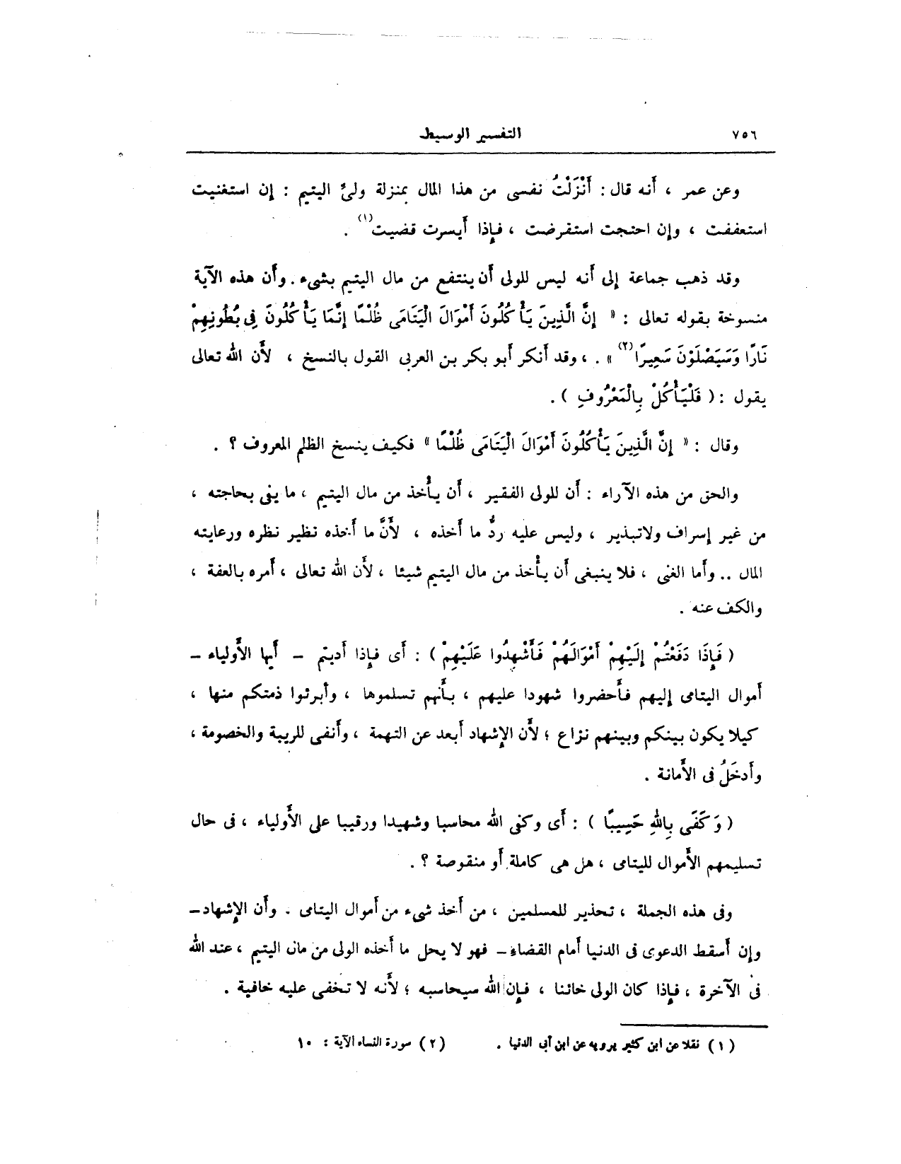 وقد ذهب جماعة إلى أنه ليس للولي أن ينتفع من مال اليتيم بشيء. وأن هذه الآية منسوخة بقوله تعالى: {إِنَّ الَّذِينَ يَأْكُلُونَ أَمْوَالَ الْيَتَامَى ظُلْمًا إِنَّمَا يَأْكُلُونَ فِي بُطُونِهِمْ نَارًا وَسَيَصْلَوْنَ سَعِيرًا} (¬2)، وقد أنكر أبو بكر بن العربي القول بالنسخ، لان الله تعالى يقول: {فَلْيَأْكُلْ بِالْمَعْرُوفِ}.