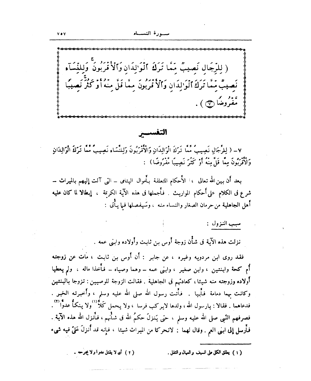 {لِلرِّجَالِ نَصِيبٌ مِمَّا تَرَكَ الْوَالِدَانِ وَالْأَقْرَبُونَ وَلِلنِّسَاءِ نَصِيبٌ مِمَّا تَرَكَ الْوَالِدَانِ وَالْأَقْرَبُونَ مِمَّا قَلَّ مِنْهُ أَوْ كَثُرَ نَصِيبًا مَفْرُوضًا (7)}.