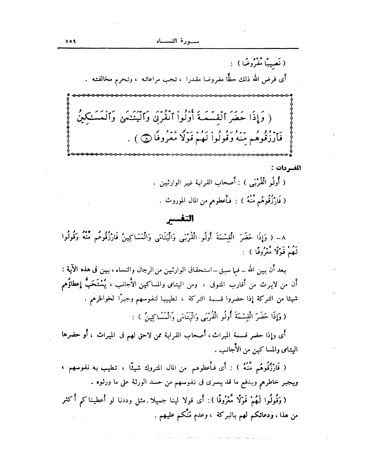{وَإِذَا حَضَرَ الْقِسْمَةَ أُولُو الْقُرْبَى وَالْيَتَامَى وَالْمَسَاكِينُ فَارْزُقُوهُمْ مِنْهُ وَقُولُوا لَهُمْ قَوْلًا مَعْرُوفًا (8)}.