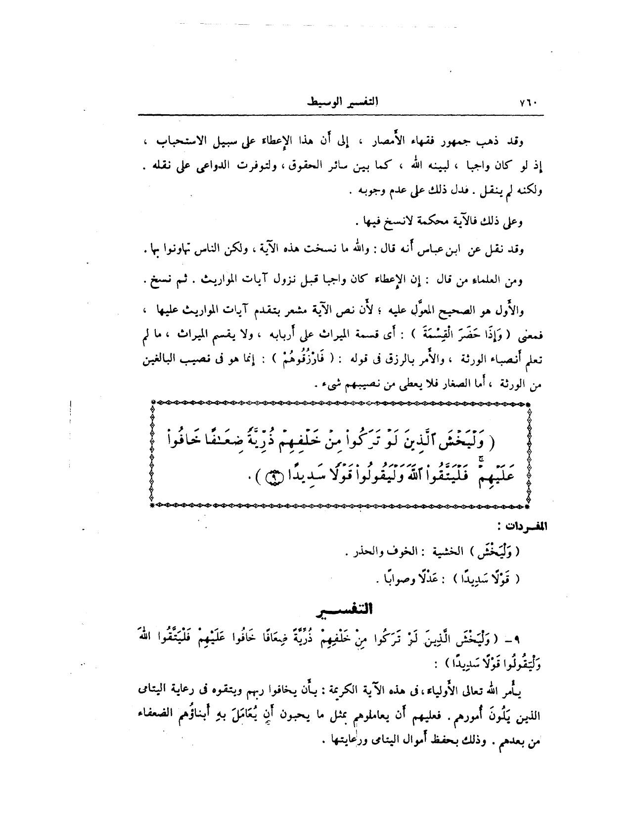{وَلْيَخْشَ الَّذِينَ لَوْ تَرَكُوا مِنْ خَلْفِهِمْ ذُرِّيَّةً ضِعَافًا خَافُوا عَلَيْهِمْ فَلْيَتَّقُوا اللَّهَ وَلْيَقُولُوا قَوْلًا سَدِيدًا (9)}.