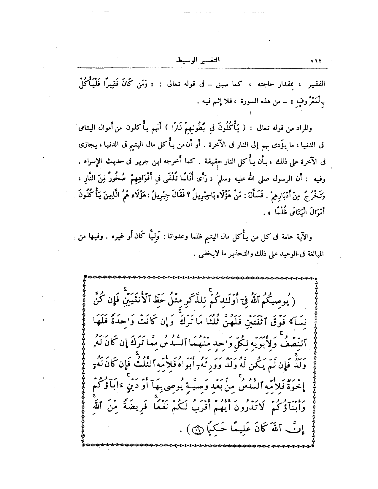 {يُوصِيكُمُ اللَّهُ فِي أَوْلَادِكُمْ لِلذَّكَرِ مِثْلُ حَظِّ الْأُنْثَيَيْنِ فَإِنْ كُنَّ نِسَاءً فَوْقَ اثْنَتَيْنِ فَلَهُنَّ ثُلُثَا مَا تَرَكَ وَإِنْ كَانَتْ وَاحِدَةً فَلَهَا النِّصْفُ وَلِأَبَوَيْهِ لِكُلِّ وَاحِدٍ مِنْهُمَا السُّدُسُ مِمَّا تَرَكَ إِنْ كَانَ لَهُ وَلَدٌ فَإِنْ لَمْ يَكُنْ لَهُ وَلَدٌ وَوَرِثَهُ أَبَوَاهُ فَلِأُمِّهِ الثُّلُثُ فَإِنْ كَانَ لَهُ إِخْوَةٌ فَلِأُمِّهِ السُّدُسُ مِنْ بَعْدِ وَصِيَّةٍ يُوصِي بِهَا أَوْ دَيْنٍ آبَاؤُكُمْ وَأَبْنَاؤُكُمْ لَا تَدْرُونَ أَيُّهُمْ أَقْرَبُ لَكُمْ نَفْعًا فَرِيضَةً مِنَ اللَّهِ إِنَّ اللَّهَ كَانَ عَلِيمًا حَكِيمًا (11)}.